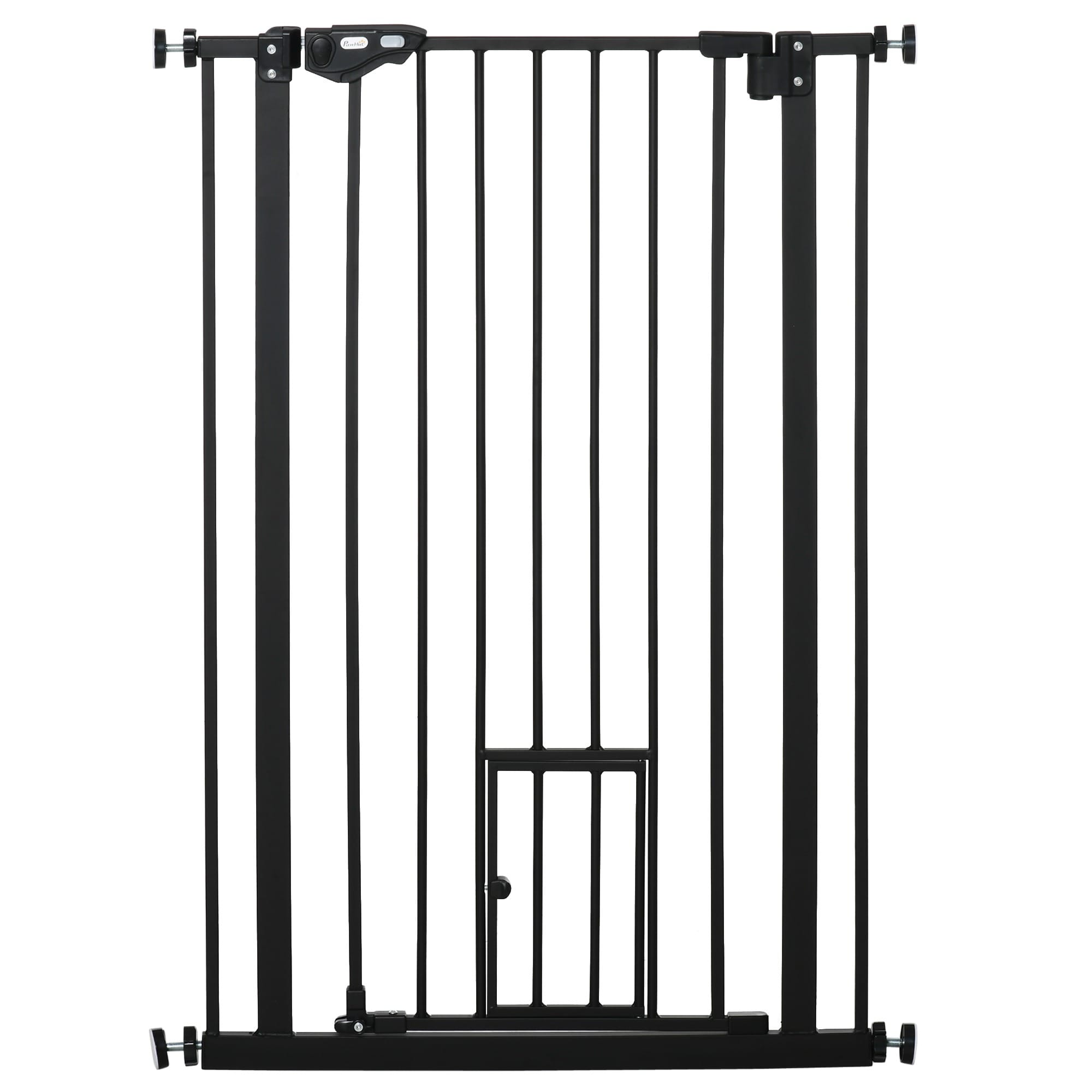 Easy to Use: Lift the door with one hand, whilst sliding the two buttons to open. Includes two rotatable locks on the bottom for extra security of this dog stair gate. Cat Door: Featured at the bottom, the stair gates for dogs keep the dogs out, but allow smaller pets can still pass through, providing a secure separation.