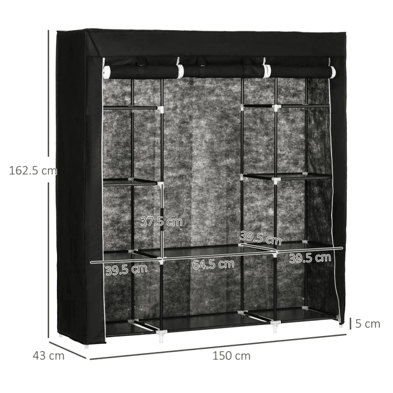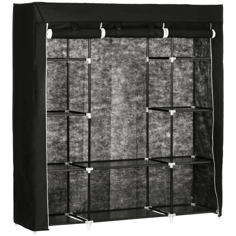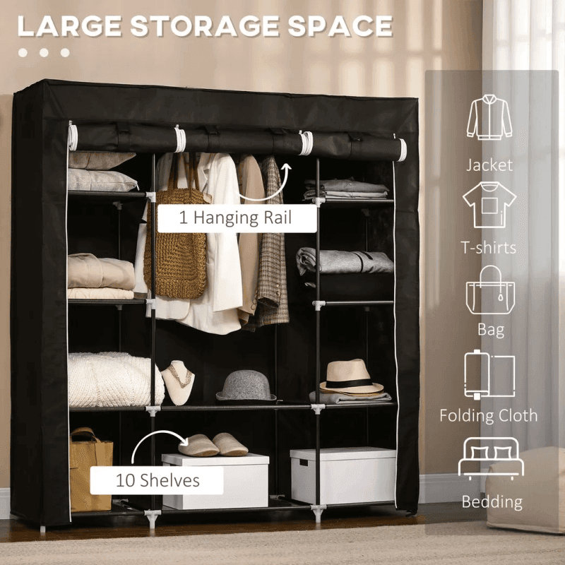 Multi-storage: A wardrobe with ten shelves and a top hanging rail. This foldable wardrobe offers plenty of storage and hanging space for clothing, bedding, accessories and more.