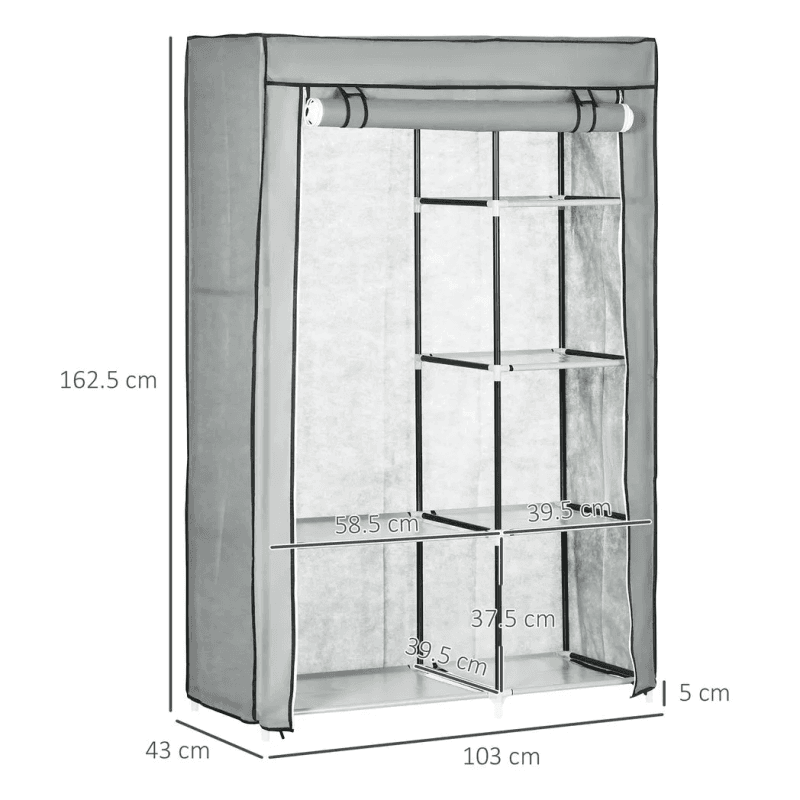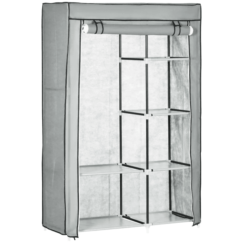Multi-storage: A wardrobe with six shelves and a top hanging rail. This foldable wardrobe offers plenty of storage and hanging space for clothing, bedding, accessories and more.