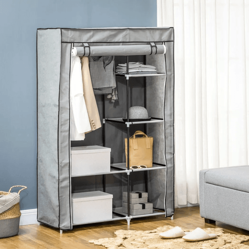 Temporary wardrobe design: Formed of a metal frame and a fabric cover, this portable closet wardrobe can be set up and taken down easily. Move it around and use wherever you need, anytime.