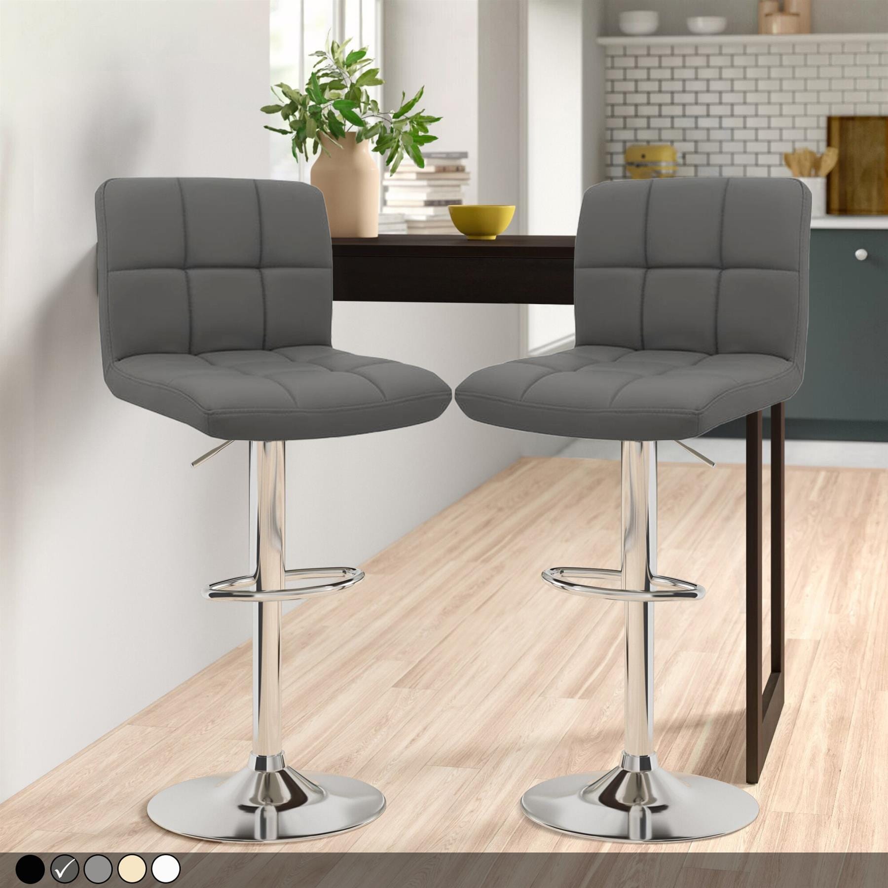 Upholstered in high quality faux leather, amply padded with a generous backrest for support. The seat stands on chrome stem, with a variable height gas lift and 360 degree swivel mechanism. Added features include a chrome footrest and a sturdy circular, with a rubber ring beneath to protect your floor.