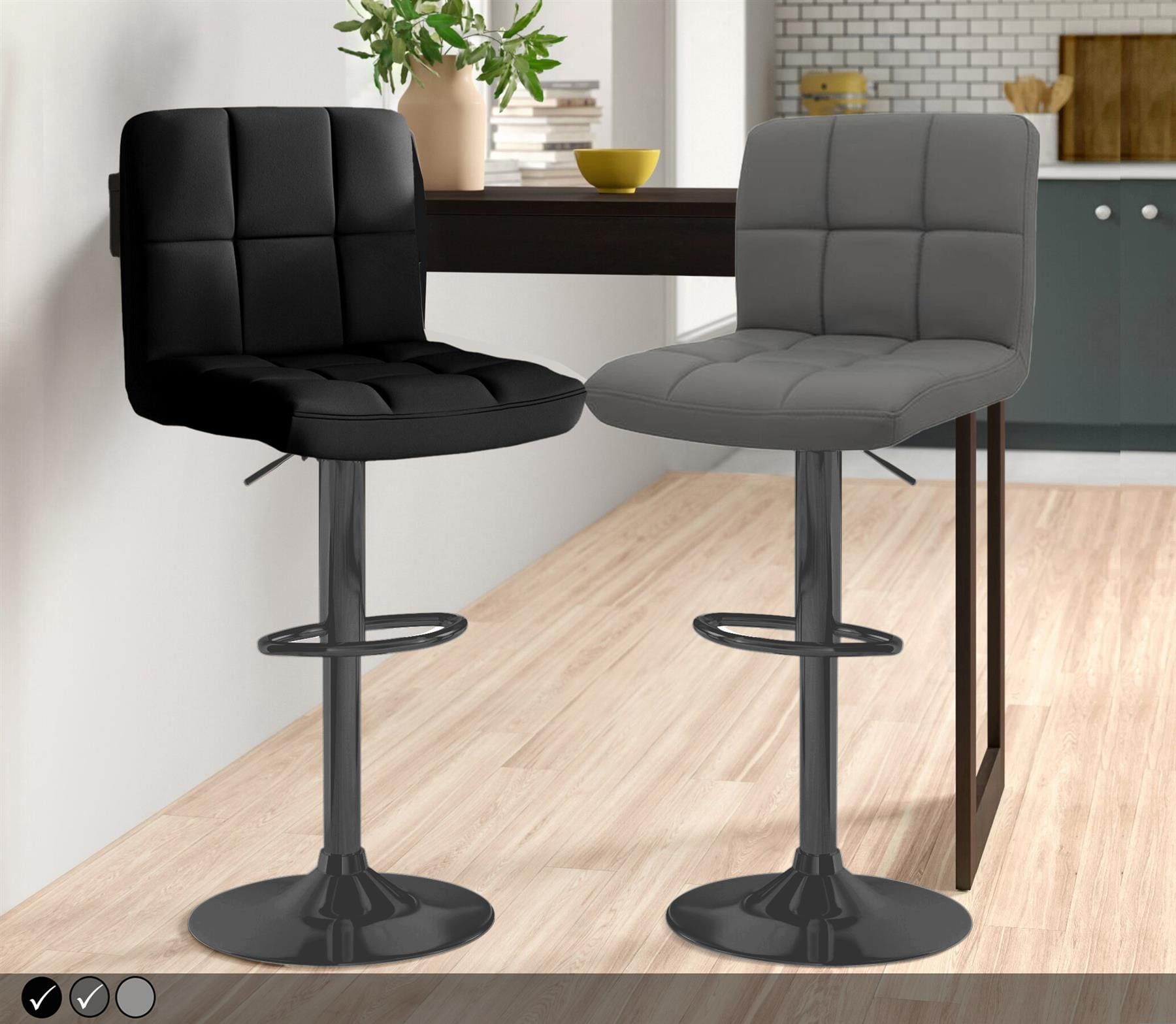 Upholstered in high quality faux leather, amply padded with a generous backrest for support. The seat stands on a matt black stem, with a variable height gas lift and 360 degree swivel mechanism. Added features include a matt black footrest and a sturdy circular, with a rubber ring beneath to protect your floor.