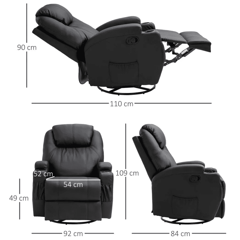– Dimensions: 109H x 92W x 84Dcm; Reclined: 90H x 84W x 110Dcm; Seat: 54W x 52Dcm; Padding thickness: 22cm.