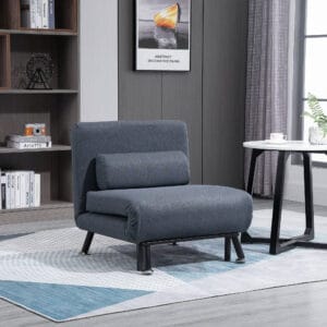 – Wide, armless chair converts into guest bed swiftly and easily