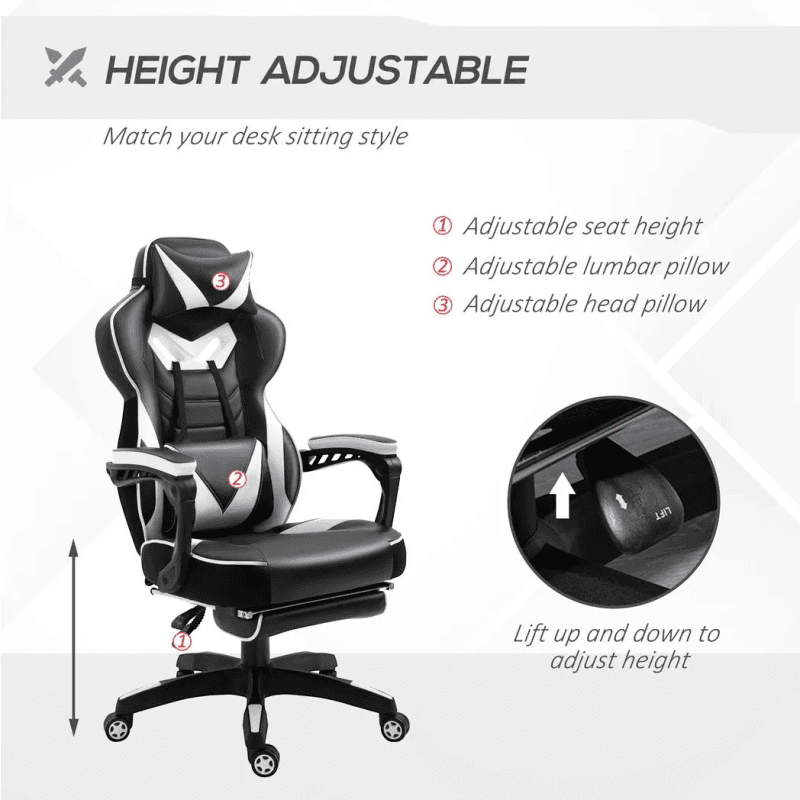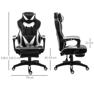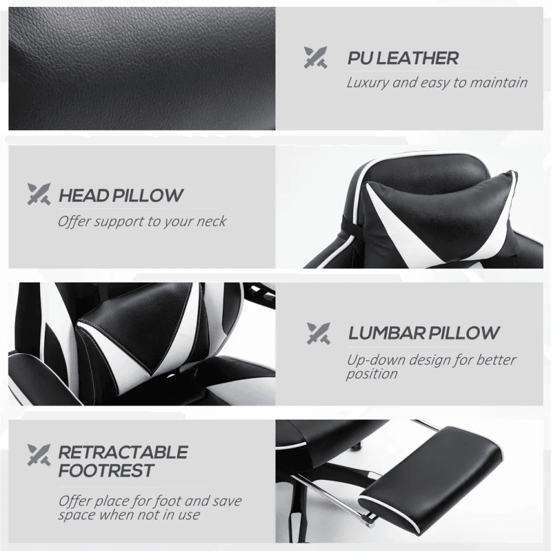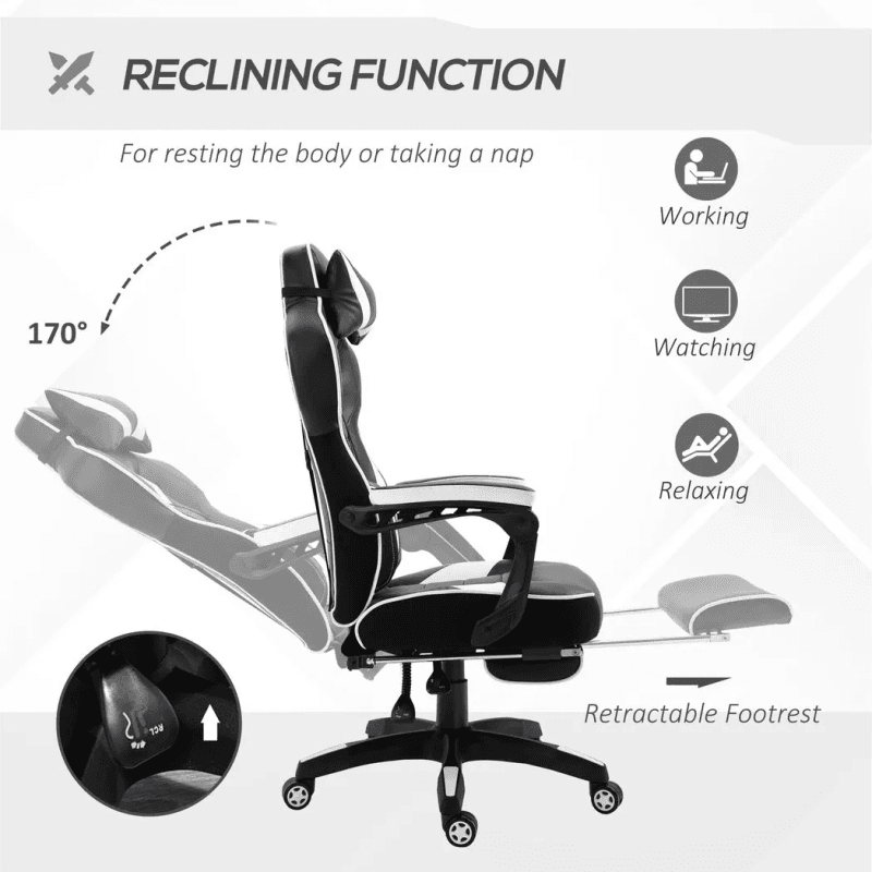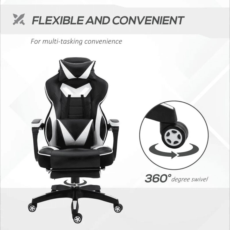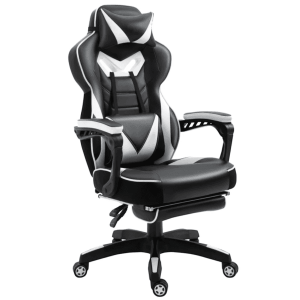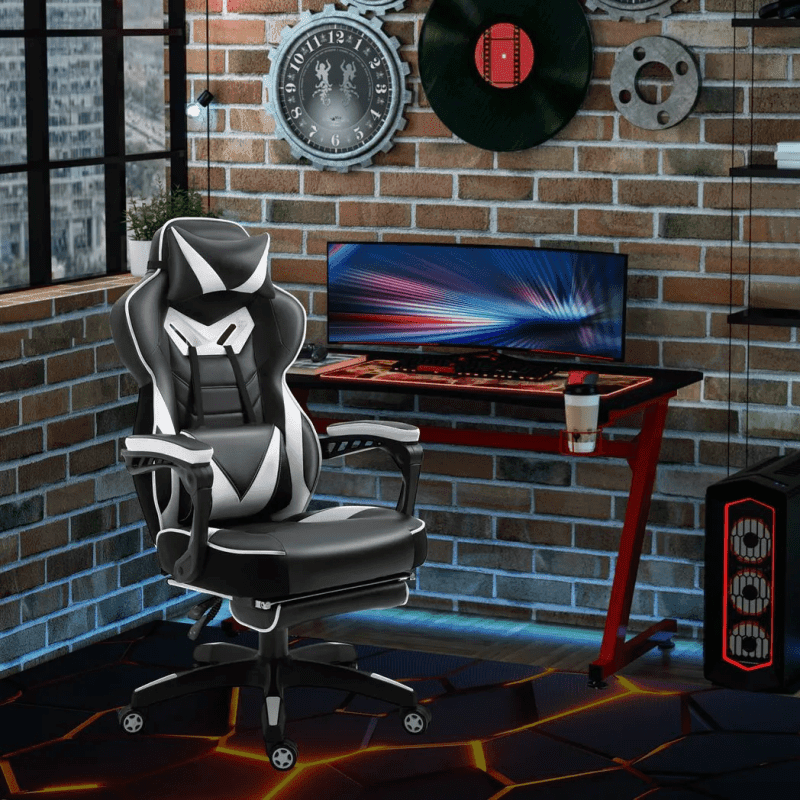 – Gaming Chair Ergonomic Reclining w/ Manual Footrest Wheels Stylish Office White