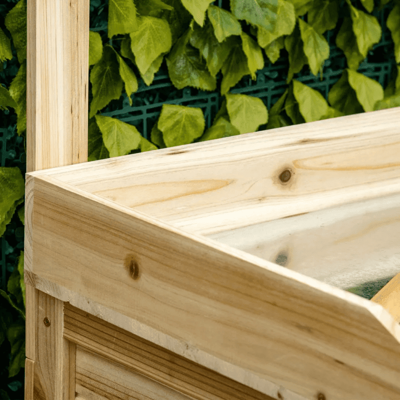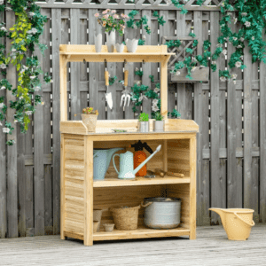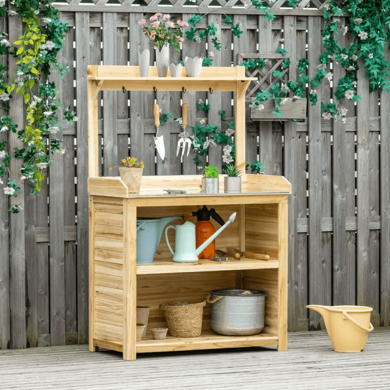 Metal table top: A solid surface to prepare anything garden-related on, on this garden potting table. Potting bench with storage: Comes with a small top shelf and two larger bottom shelves. Hooks below the top shelf. Plenty of room for garden essentials. Wooden structure: Fir wood body, this planting table is a strong piece. Natural finish to leave how it is or paint to your style. Dimensions: 162H x 103W x 53Dcm. Table top: 90H x 100W x 49Dcm. Top shelf: 103W x 12Dcm. Bottom shelf: 94.5W x 48Dcm.Maximum load: Table top: 50kg. (countertop), 25kg (clapboard), 5kg (hook)