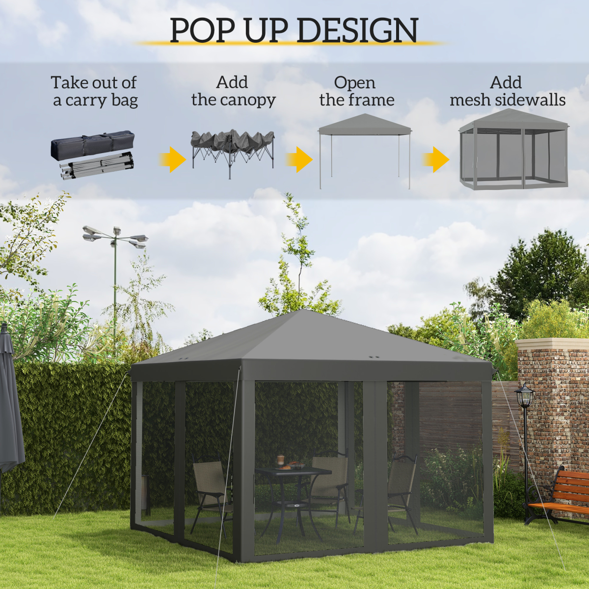 A handy shelter for your outdoor gatherings, assembled oh so quickly – bring this Outsunny 3 x 3m heavy duty pop up gazebo with sides to your garden, this season and beyond. The three-level adjustable metal frame means a strong core, which can set to a height most suitable for you. Comes with removable mesh curtains – create a private and open feel easily. Bag included to store and carry easily.