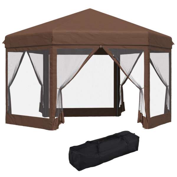 Large hexagon design to house large parties in your garden and outdoor areas Powder coated metal frame is strong and tough, keeping the structure upright and stable Zipped mesh netting curtains all around, keeping mosquitoes and bugs out when down Weather-resistant roof to keep inside dry from medium rain and wind Height is adjustable to three different levels Carry bag and ground stakes included Assembly required