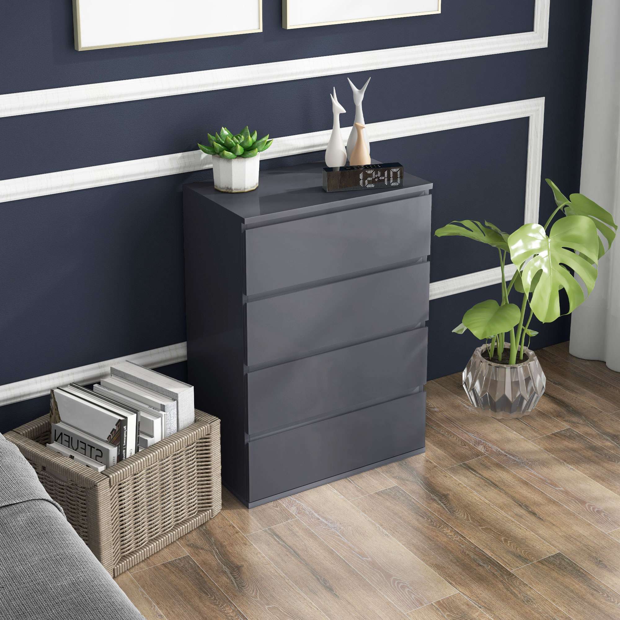 – Four drawers: storage space for organising clothing and more. Metal rails to open/close drawers smoothly