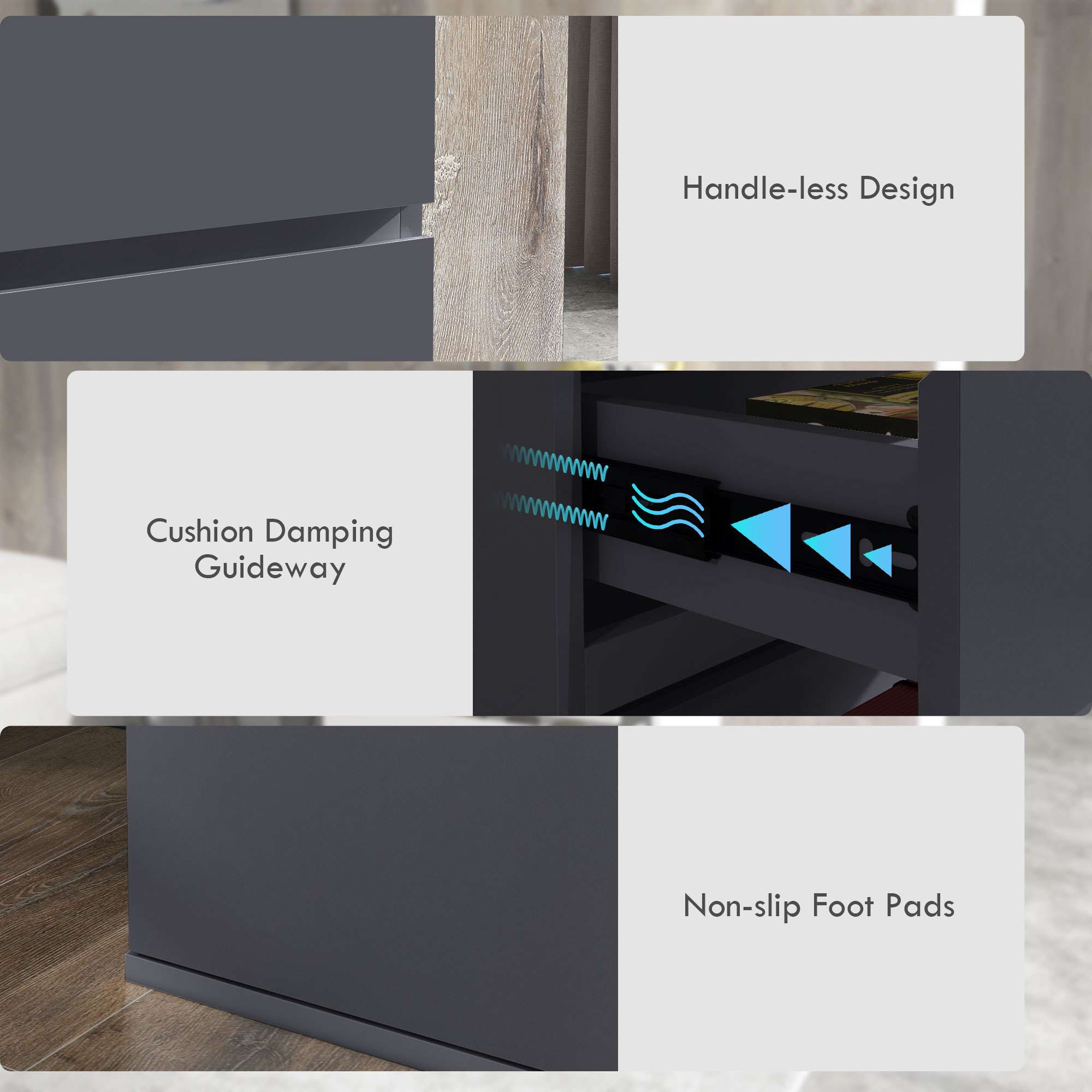 – Cushion damping guideway makes soft closing and prevent fingers from being pinched