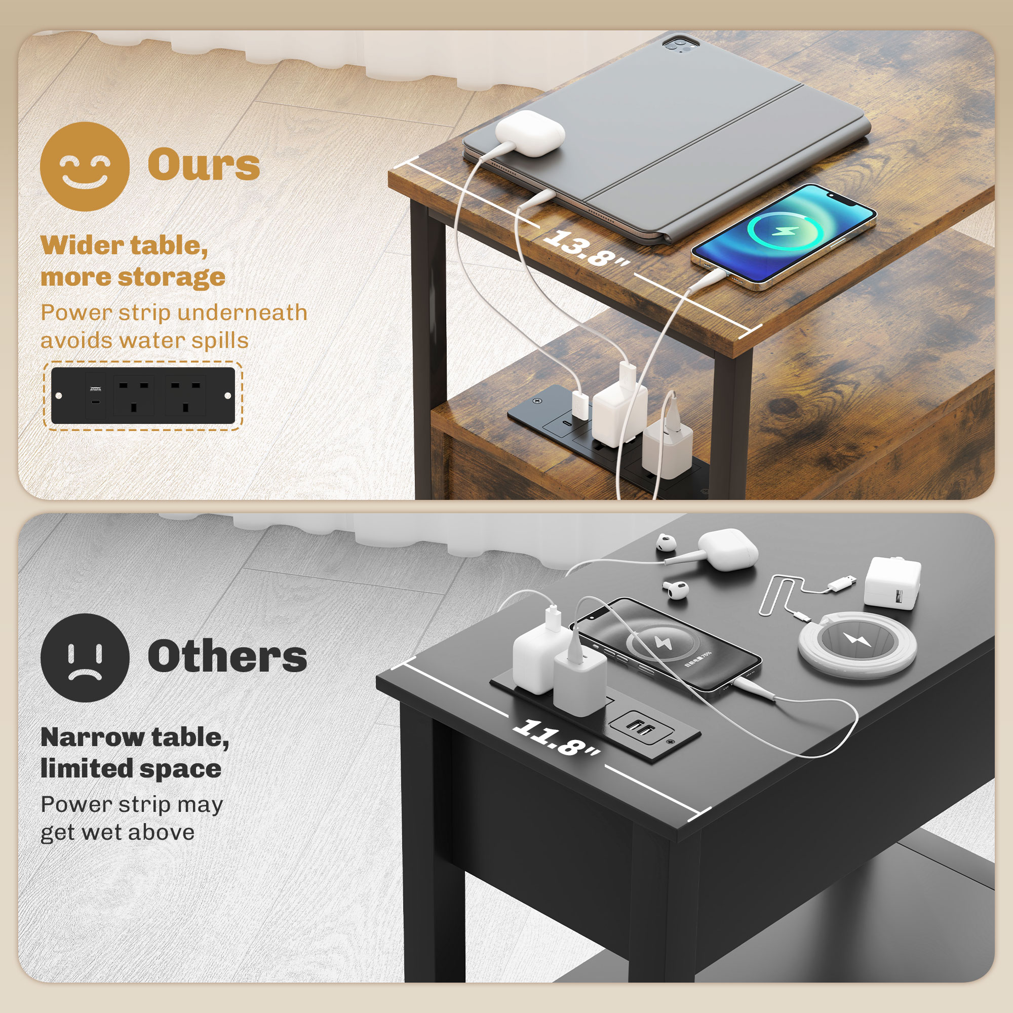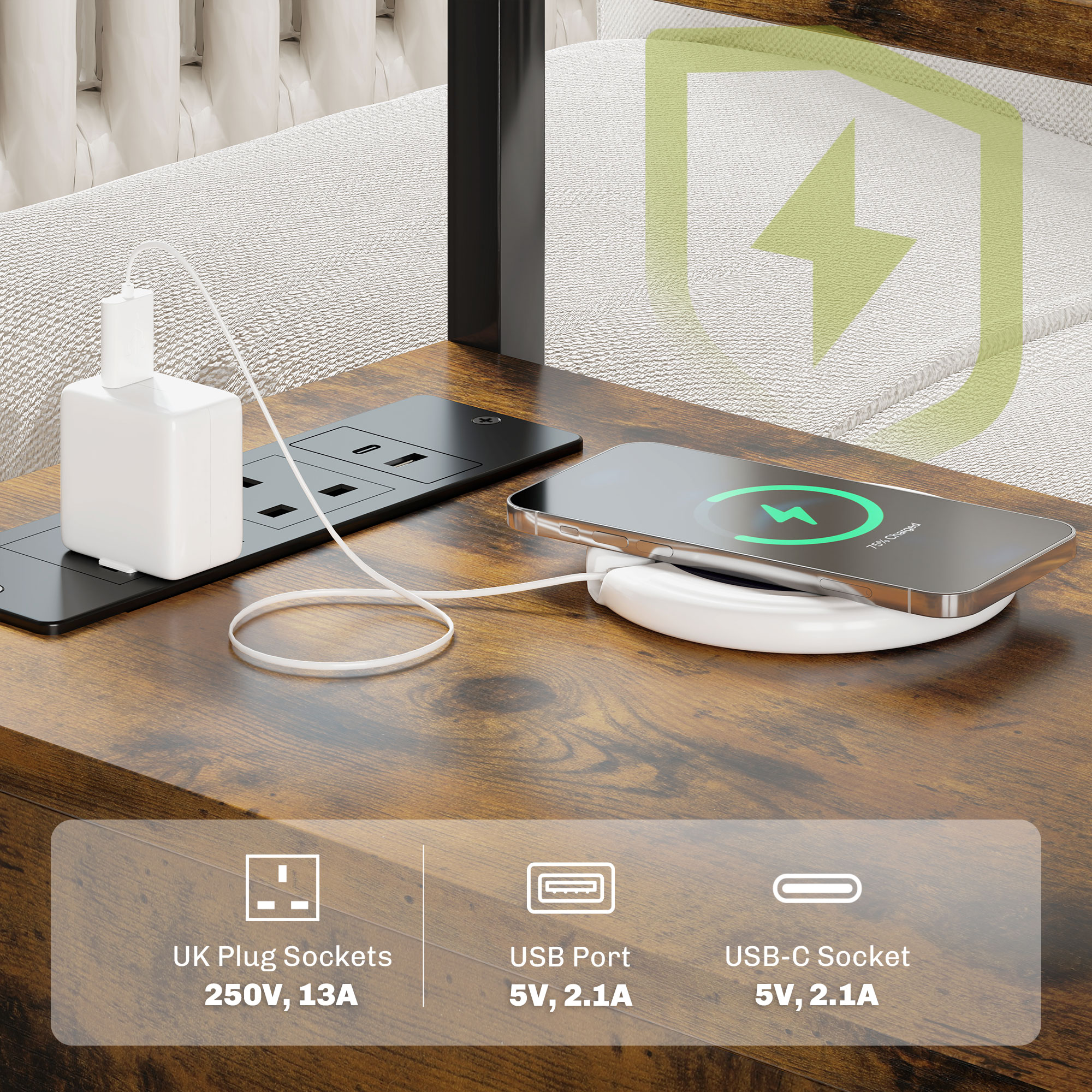 ? Two 3-prong sockets, a USB port and a Type-C socket allow charging of multiple devices