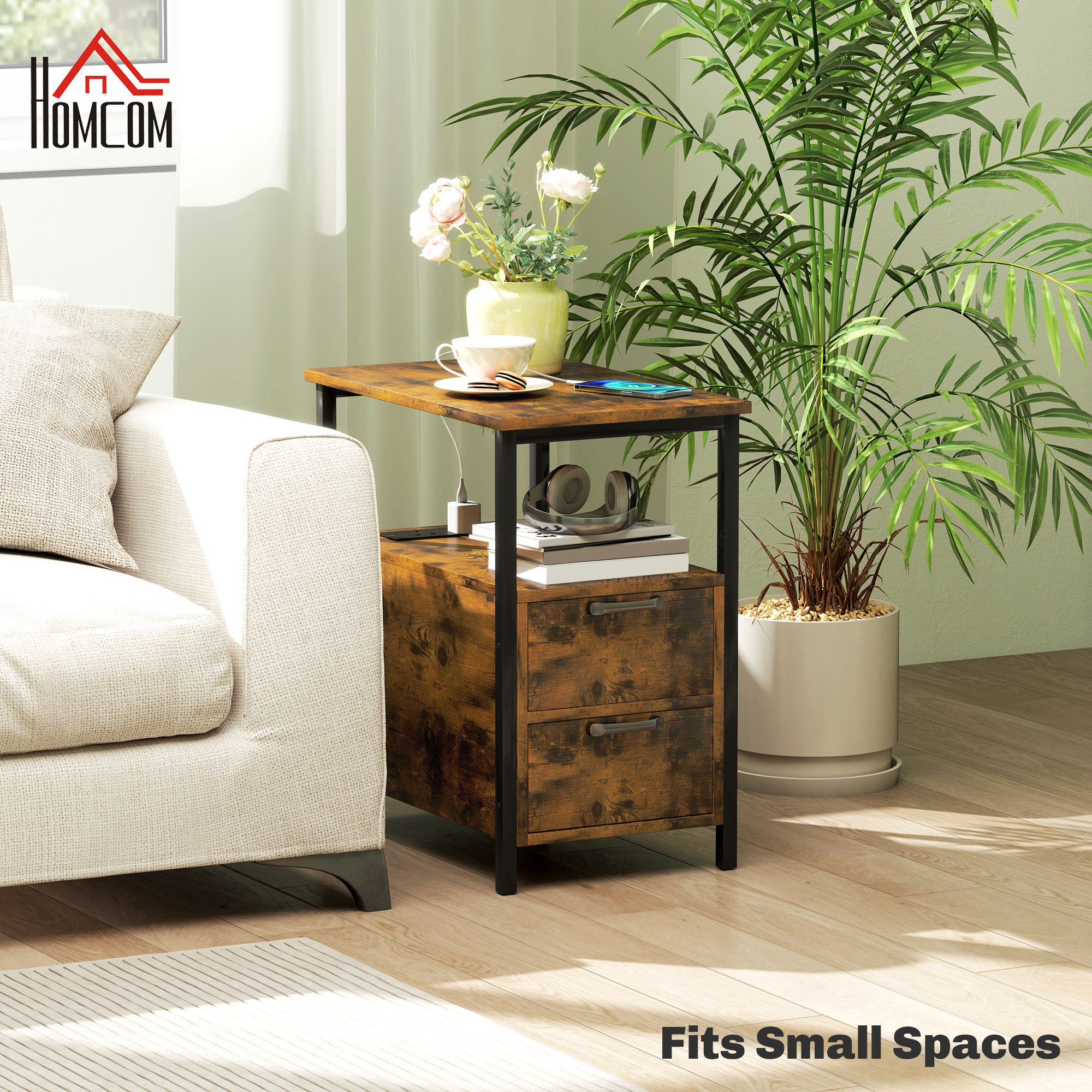 ? Two drawers, an open shelf and tabletop provide spacious storage space