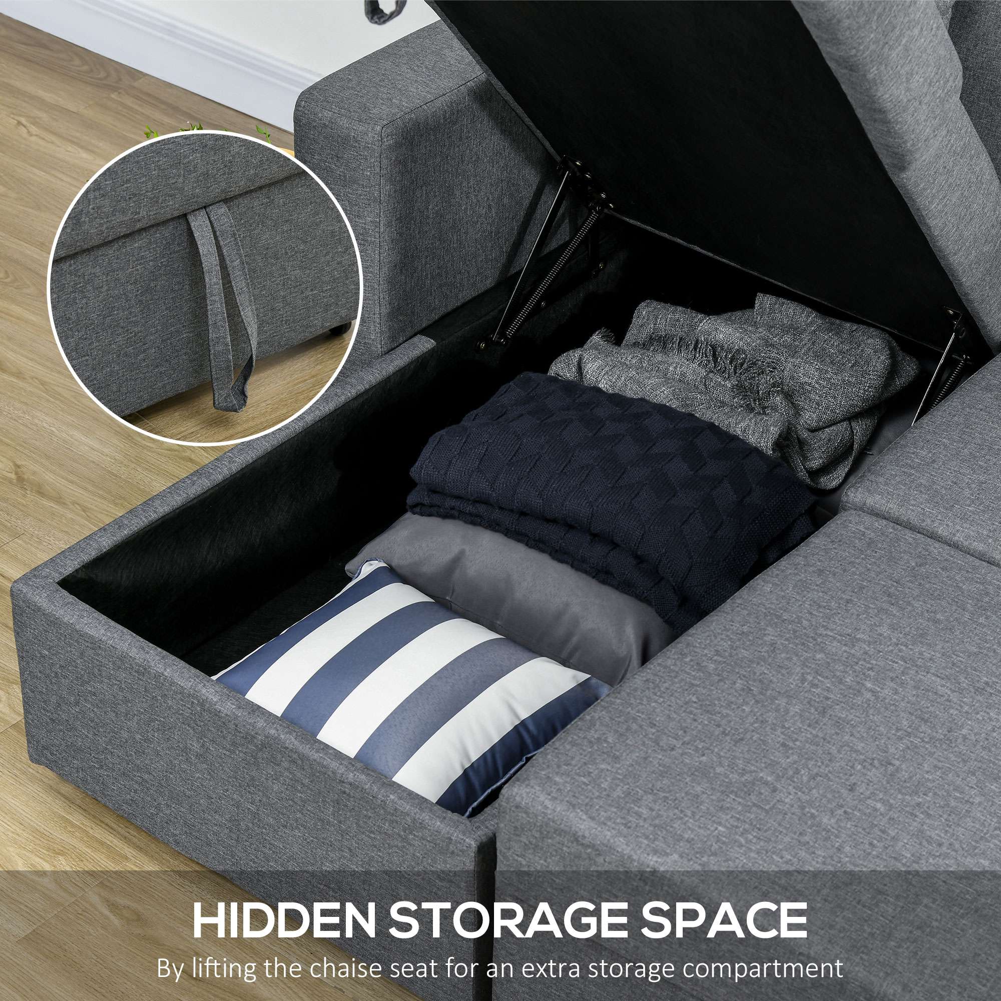 ● Hidden storage compartment under the chaise seat for blankets, toys, etc.;