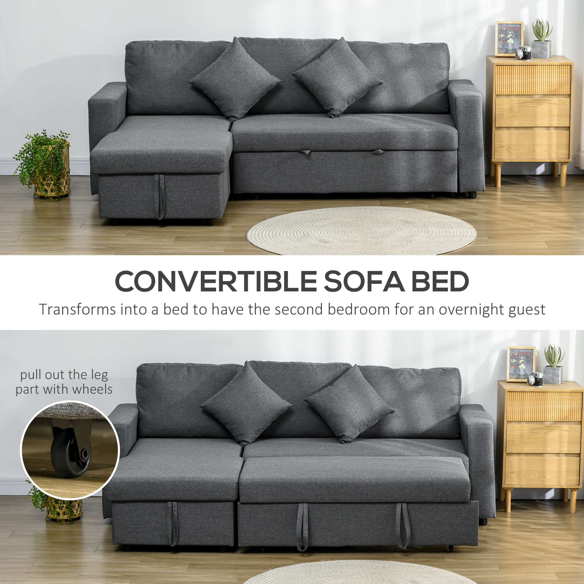 ● Easily transform into a bed by pulling out its leg part with moving wheels;