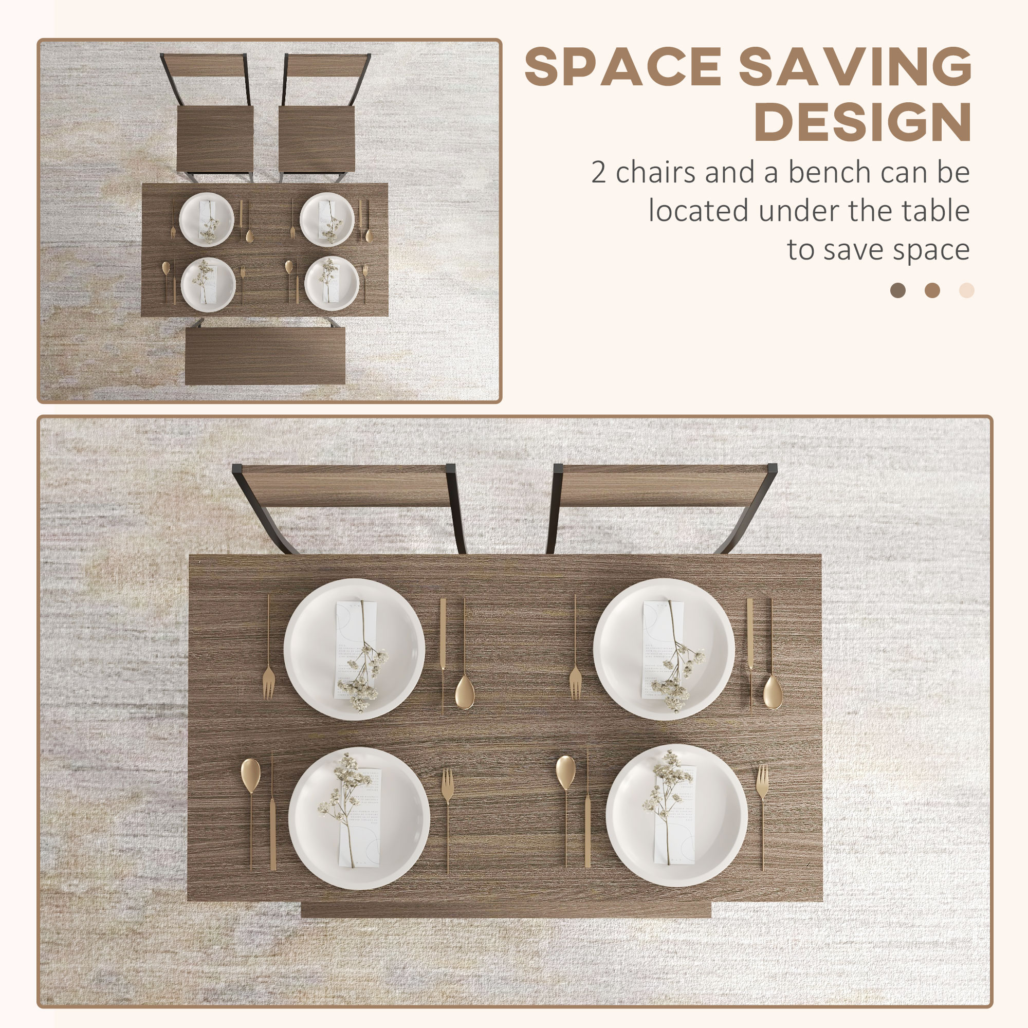 A forever-stylish focal point for family dinners and more with this HOMCOM dining table set. Powder coated steel frames for strong cores, fitted with durable particle board tops. The wood-effect is classic and looks greats in a wealth of home interiors. The dining room set comes with a rectangular dining table, two-seater bench and two chairs. Complete with a small shelf underneath the bench seat.