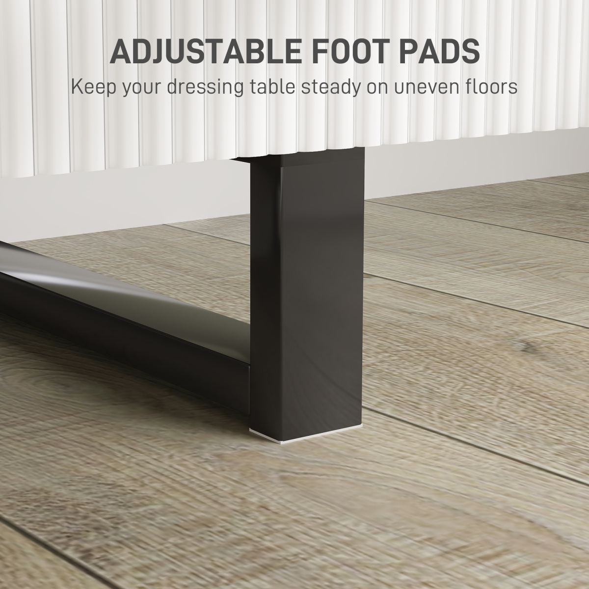Transform your daily routine with the HOMCOM vanity desk with mirror and drawers! Its USB-powered lighted mirror adds a touch of glam, ensuring flawless makeup application. Tidy up with ease using two bottom and three side drawers. This modern, leaf-shaped mirror makeup desk, complete with a robust metal frame, is the stylish organisational solution you’ve been searching for.