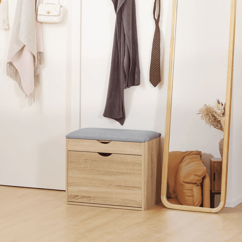 Two-part storage: A small top compartment with lid and bottom cupboard with flip-up panel. Shoe storage bench holds four pairs of shoes roughly. Padded seat: A place to sit comfortably on this hallway bench. Linen-look upholstery for breathability and style. Compact and freestanding: Easy to stand in your hallway, living room and bedroom, this shoe storage cabinet doesn’t take up much space. Sturdy: Made from particle board, this shoe storage unit it sturdy, suitable for everyday use. Dimensions: 50H x 60W x 30Dcm. Maximum load: 98 kg. Assembly required.