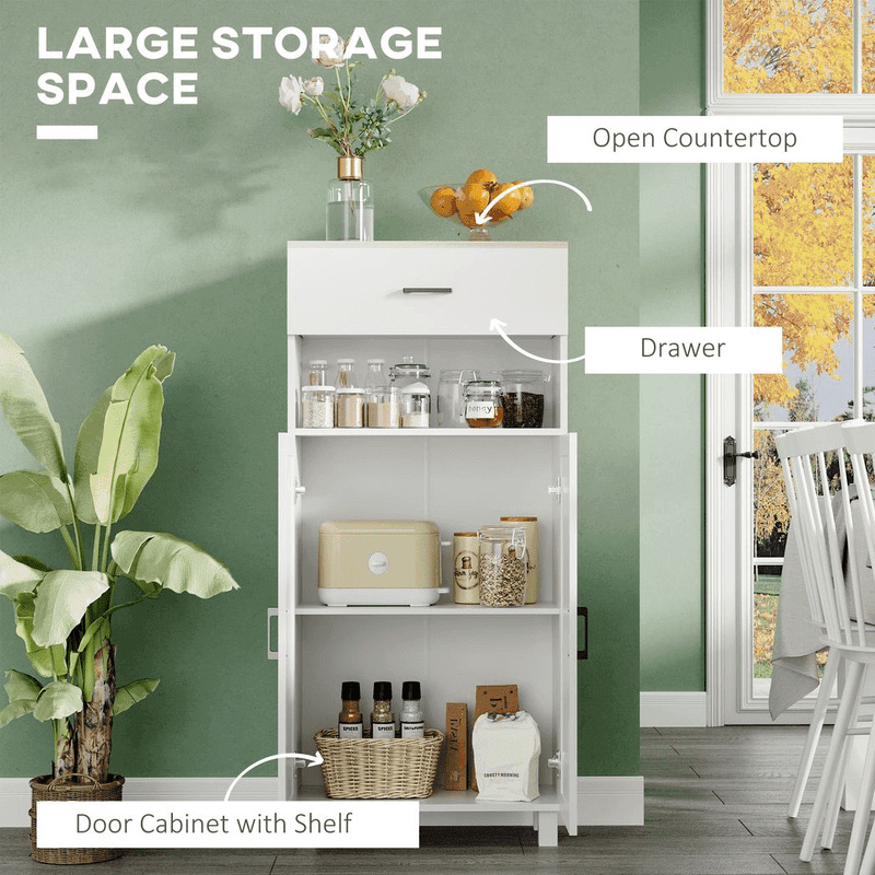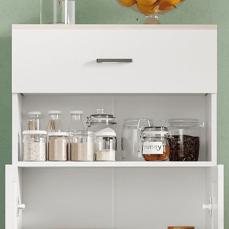 Multi-storage: Kitchen storage cupboard features a top drawer, open middle compartment and a bottom cupboard with fixed shelf – plenty of varied storage. Simple design: White colour, with a wood effect top and black handles: kitchen storage unit is simple – a versatile piece. Sturdy: Made from particle board, this pantry cupboard is durable and sturdy. Anti-tipping straps: Attach this kitchen cabinet to a wall to keep it secure in place. Suitable for homes with children and pets. Dimensions: 130H x 60W x 30Dcm. Maximum load 40kg. Assembly required.