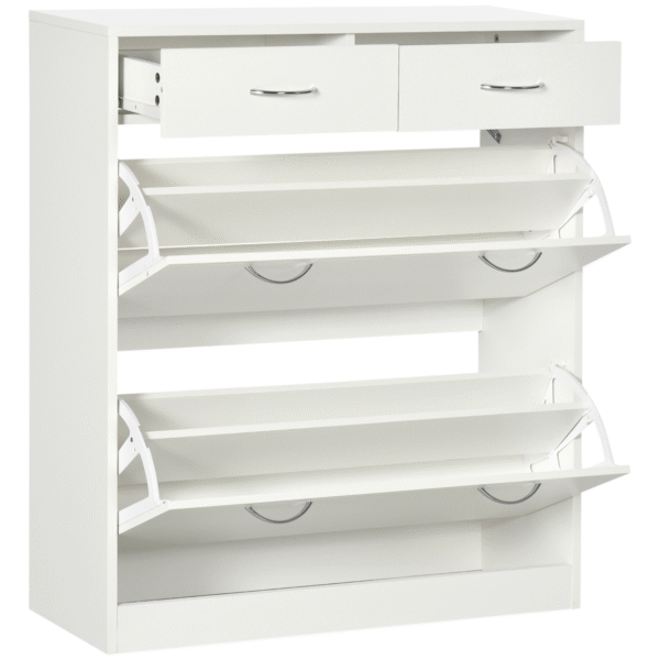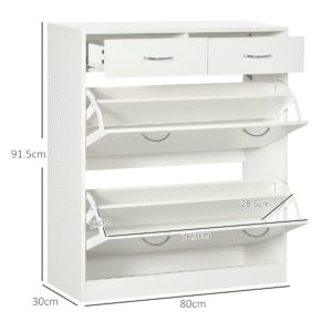 perfect for smaller spaces. Features two flip doors with a middle adjustable shelf: holds up to 12 shoe pairs, maximum UK size 9.5. Two top drawers and a flat top for extra display and holding room. Made from particle board, this is a sturdy piece for the everyday