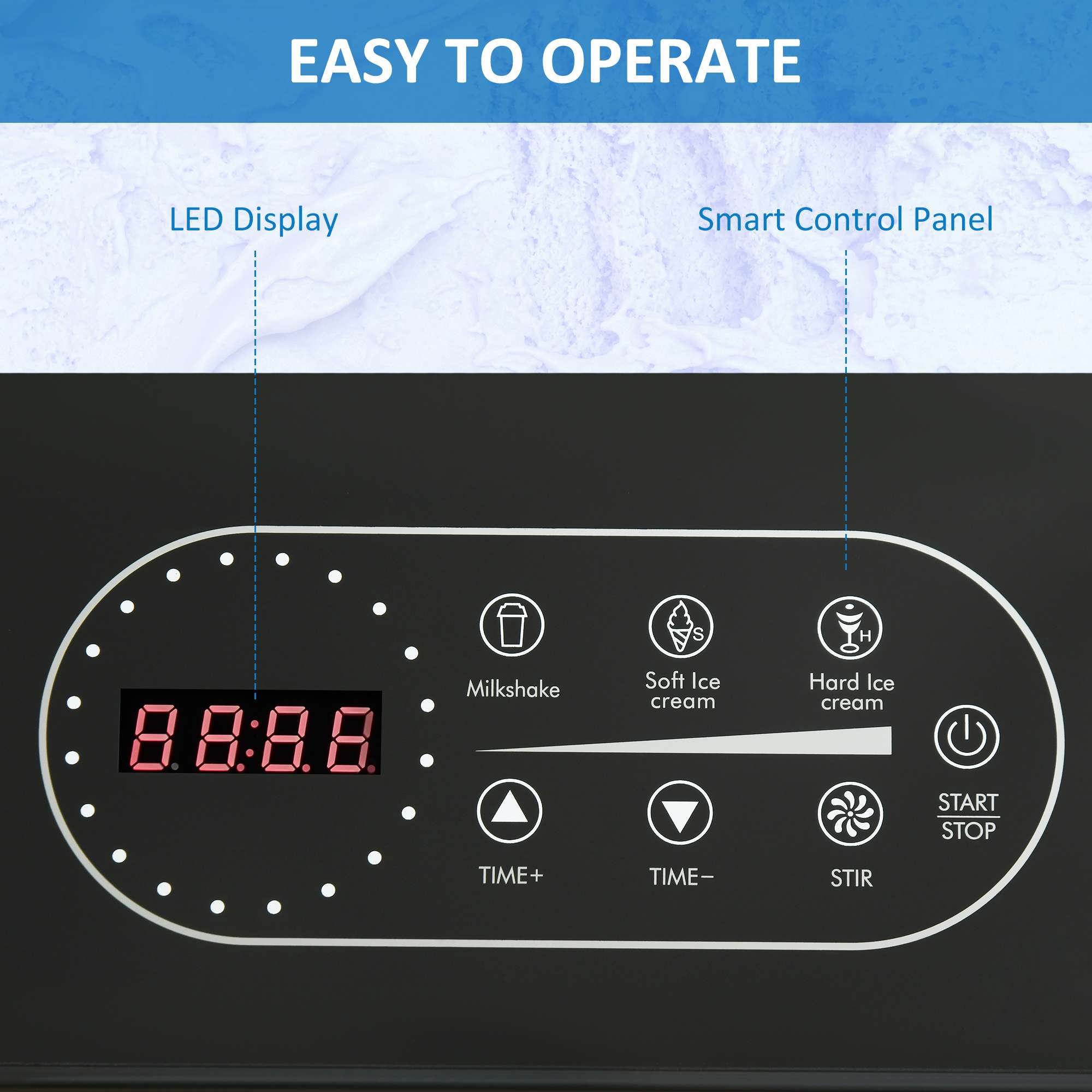 Three settings: Hard and soft ice cream and milkshake. Also makes frozen yogurt and gelato