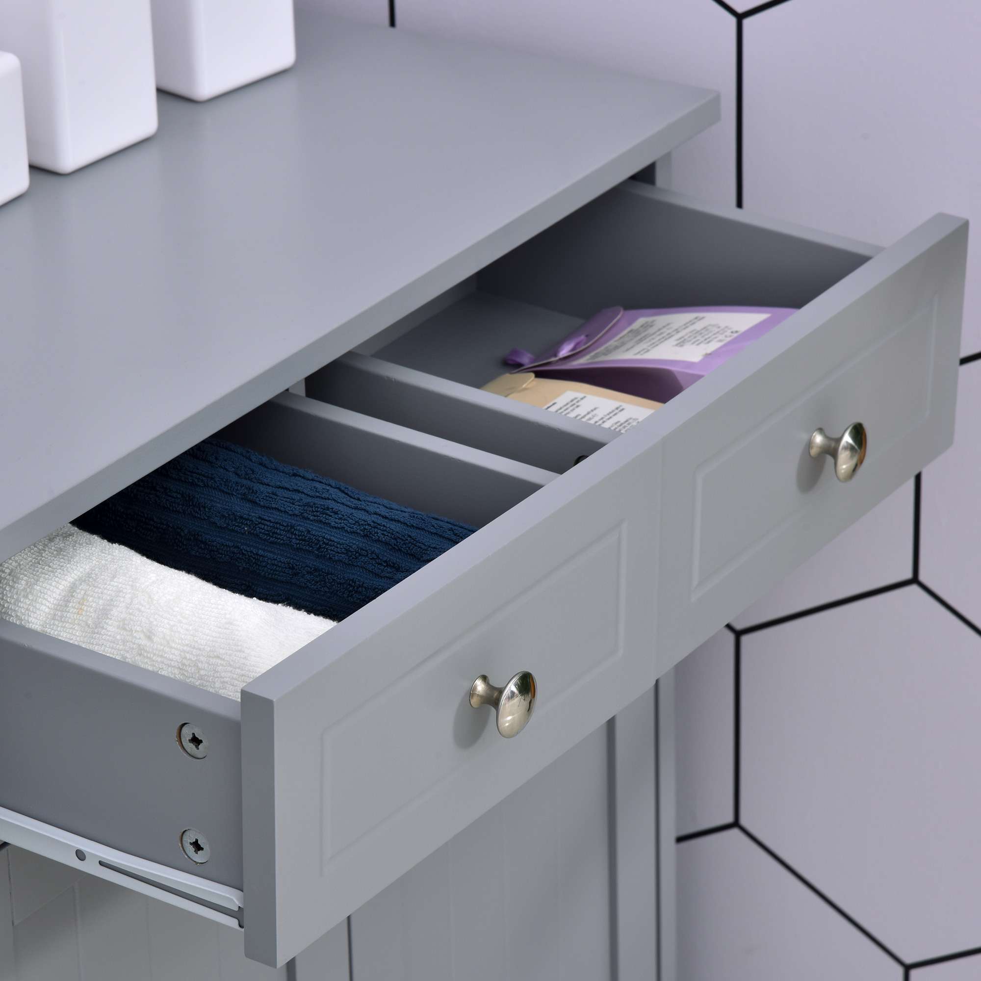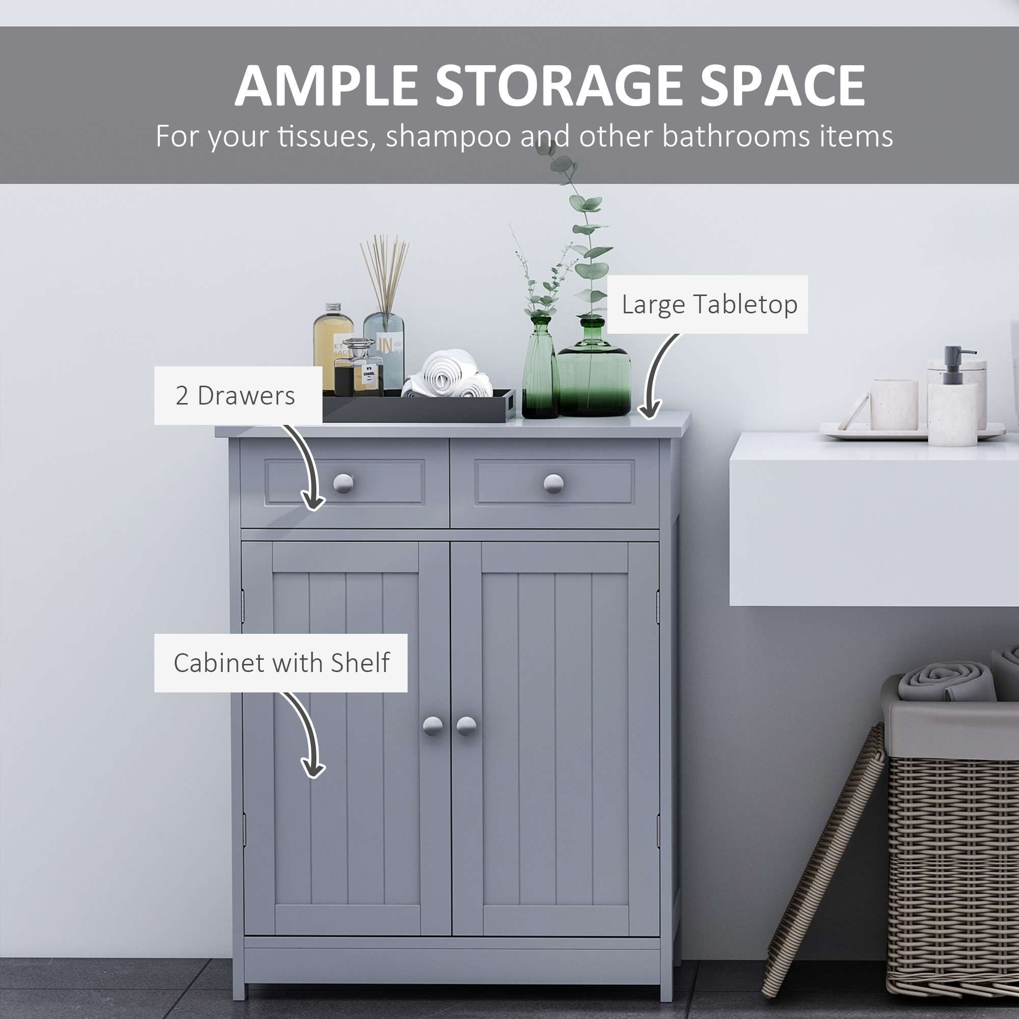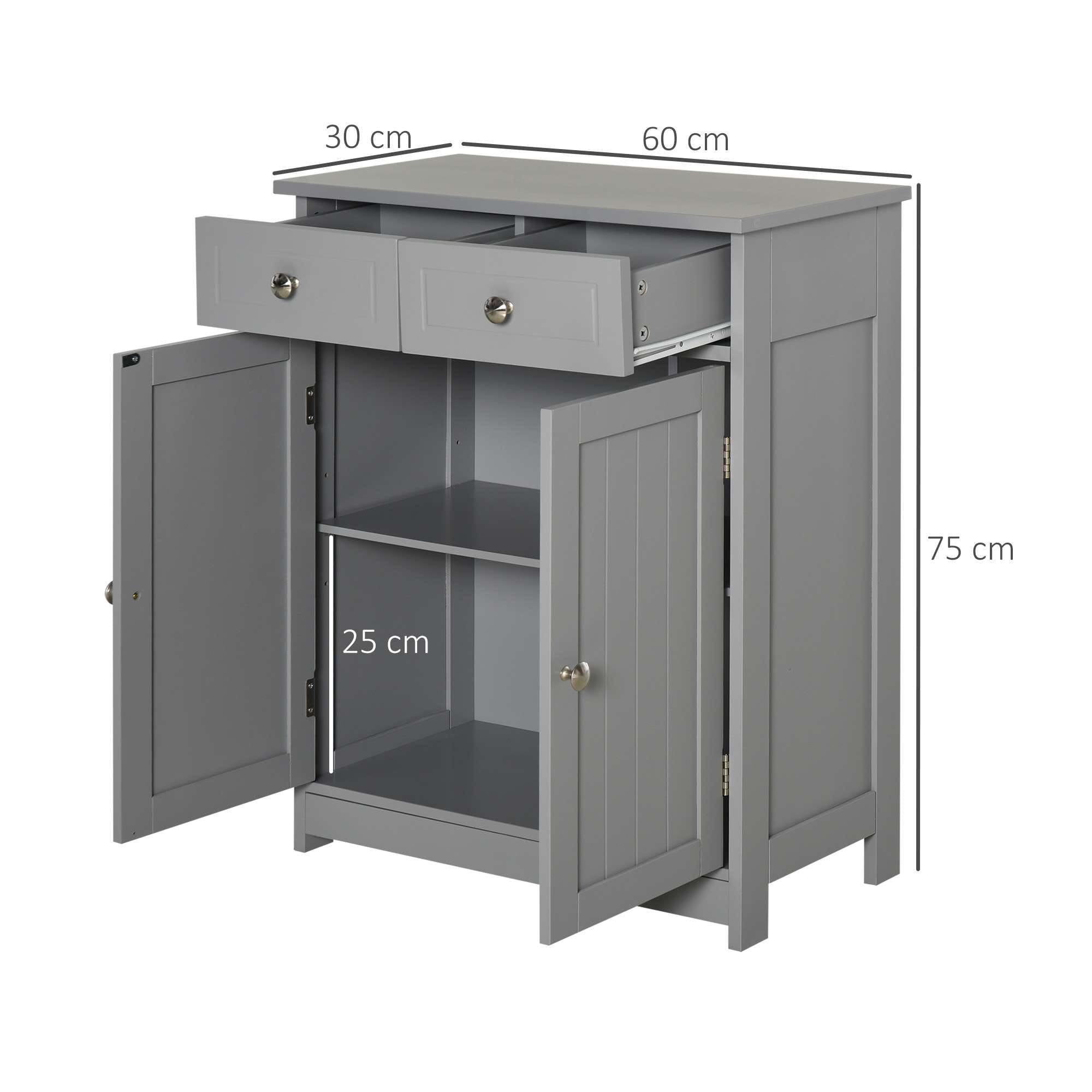 SOLID FRAME: Crafted from MDF, the structure is solid and durable for everyday use in the bathroom. Painted surface is water and moisture resistant. LARGE STORAGE: Built with two top drawers and a bottom cupboard – providing plenty of room for holding your toiletries and other bathroom essentials. Adjustable shelf in cupboard. TRADITIONAL APPEAL: Versatile and all-match colour scheme. Carved grooves on the drawers and doors, with polished handles for a sleek look. ELEVATED: Four feet to protect the bottom from water and light damage. DIMENSIONS: 75H x 60L x 30Wcm.MAXIMUM LOAD 24KG. ASSEMBLY REQUIRED.