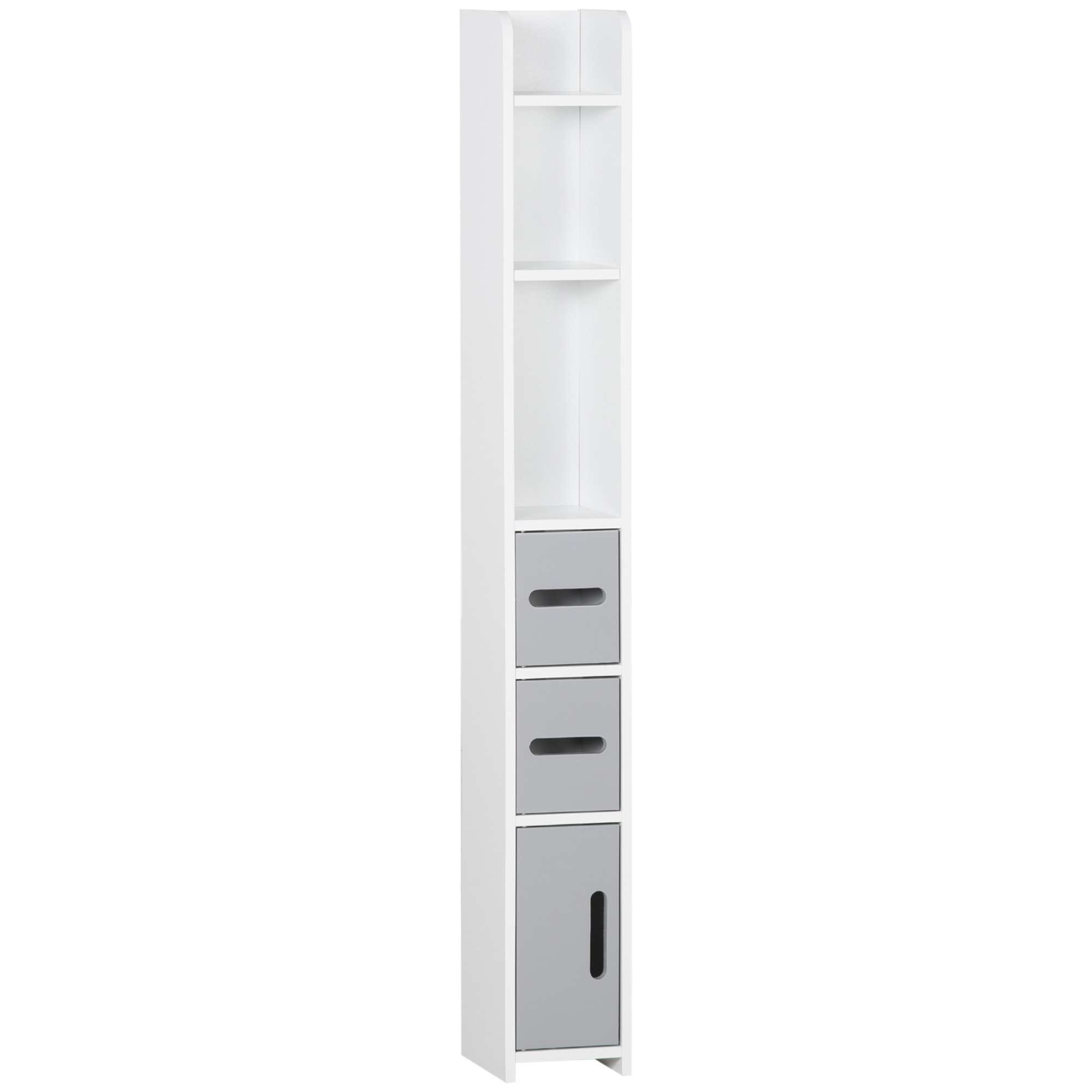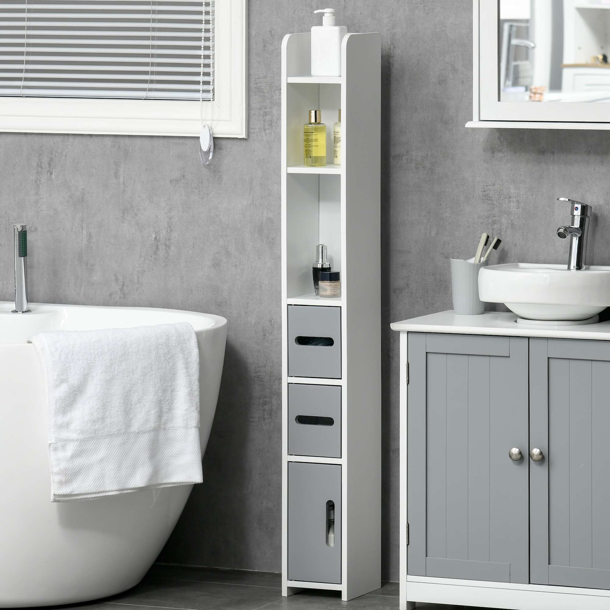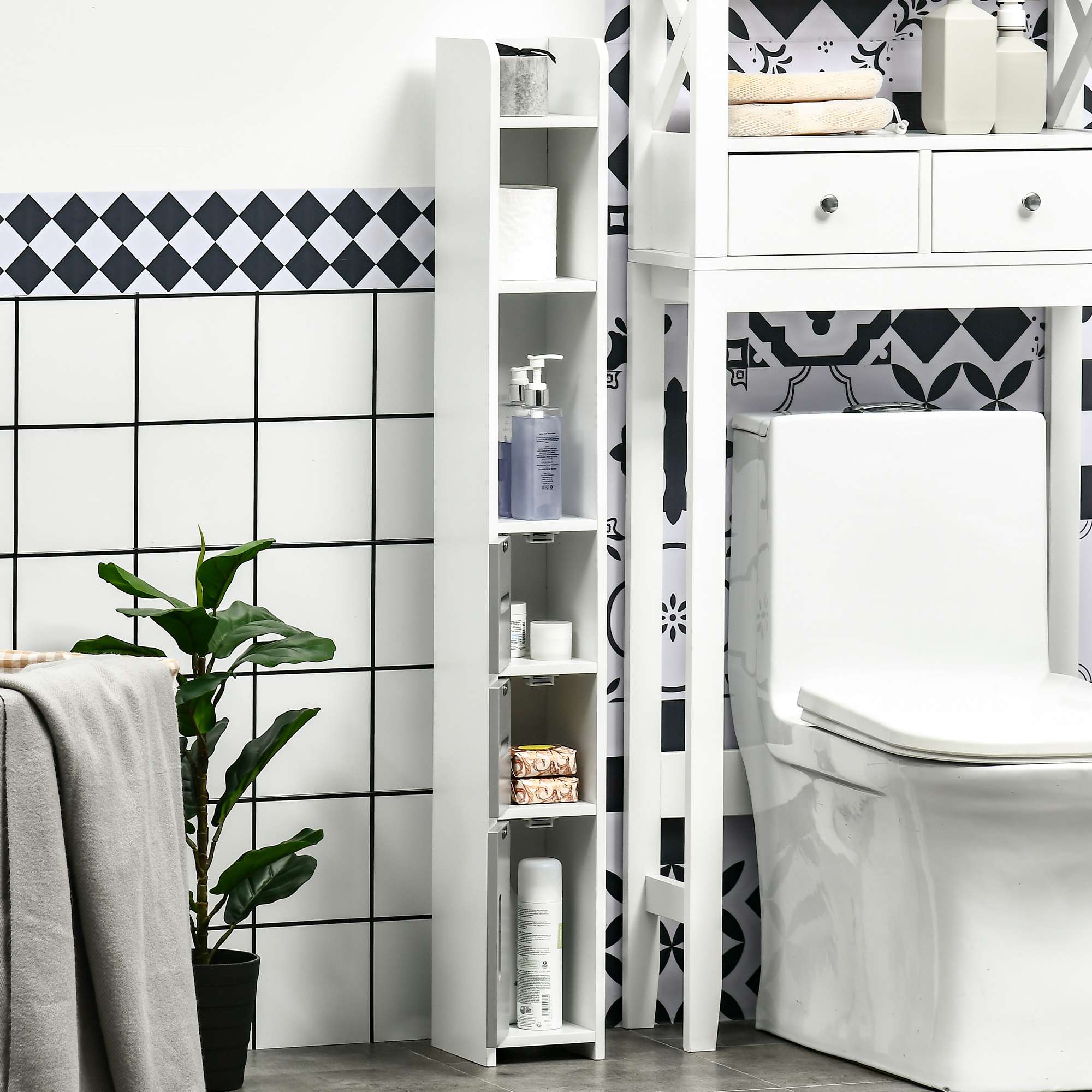 Mixed storage: This narrow bathroom organiser features three open shelves and three compartments with doors. Plenty of room to organise bathroom essentials.