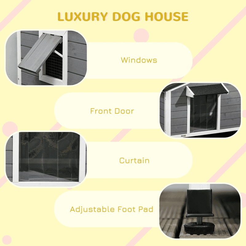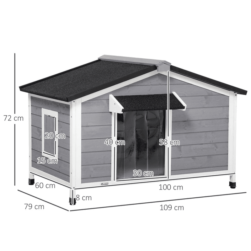 – Dimensions: 72H x 109L x 79Wcm. Without eaves: 72H x 109L x 70.5Wcm. Main house: 58H x 100L x 60Wcm. Window: 20H x 15Wcm. Right: 6H x 16Wcm. Door: 40H x 30Wcm. Door eaves: 9H x 39W x 13Dcm. Leg: 8Hcm