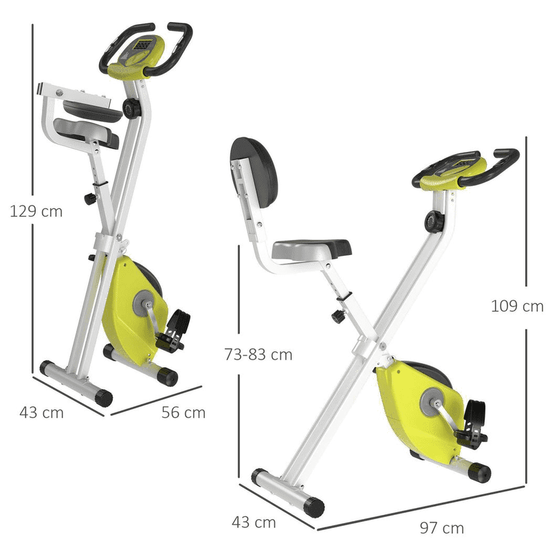 Adjustable Resistance: The workout bike is adjustable to eight different magnetic tensions, allowing you to set to a level which is suitable and safe for you. LCD Monitor: The indoor cycling bike is equipped with LCD display which keeps track of your heart rate (via metal detecting panels on handlebar), speed, distance, time elapsed and calories burnt to record progress. Adjustable Seat: The seat of the stationary exercise bike can be set to five different heights to suit you, with a backrest offering support when leaning back. Large foot pedal with straps to keep feet stable. Applicable height from 155-180cmFoldable Metal Frame: ‘X’ shape of the bike trainer for extra support when in use, it is strong and durable and is compact when stored away. Rubber pads on feet for floor protection. Dimensions: 109H x 43W x 97Dcm. Folded: 129H x 43W x 56Dcm. Seat: 73-83Hcm. MAXIMUM WEIGHT 110KG.