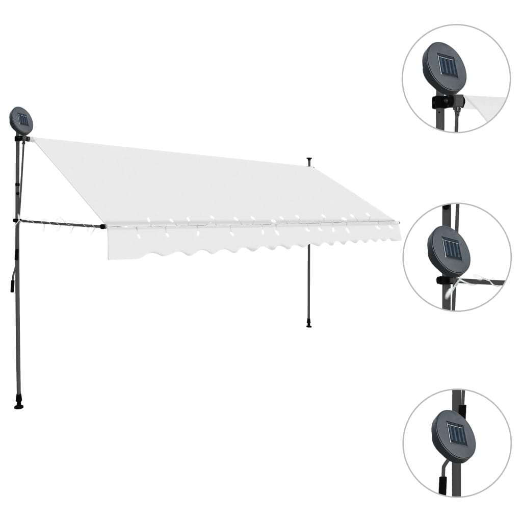 This retractable awning will be ideal for use in front of the window, on the terrace, balcony or in your garden. This water- and dirt-repellent and UV- and weather-resistant awning is made of quality polyester with a PU coating. The strong steel frame makes the awning sturdy and durable. The easy-to-clean polyester canopy can be removed and washed. Thanks to the handle crank, this awning is retractable. The height and the angle of the awning can also be adjusted. In addition, the solar powered LED lights provide energy saving lighting at night. The awning is easy to assemble. This awning is a perfect choice for your outdoor living space and can easily be operated manually.