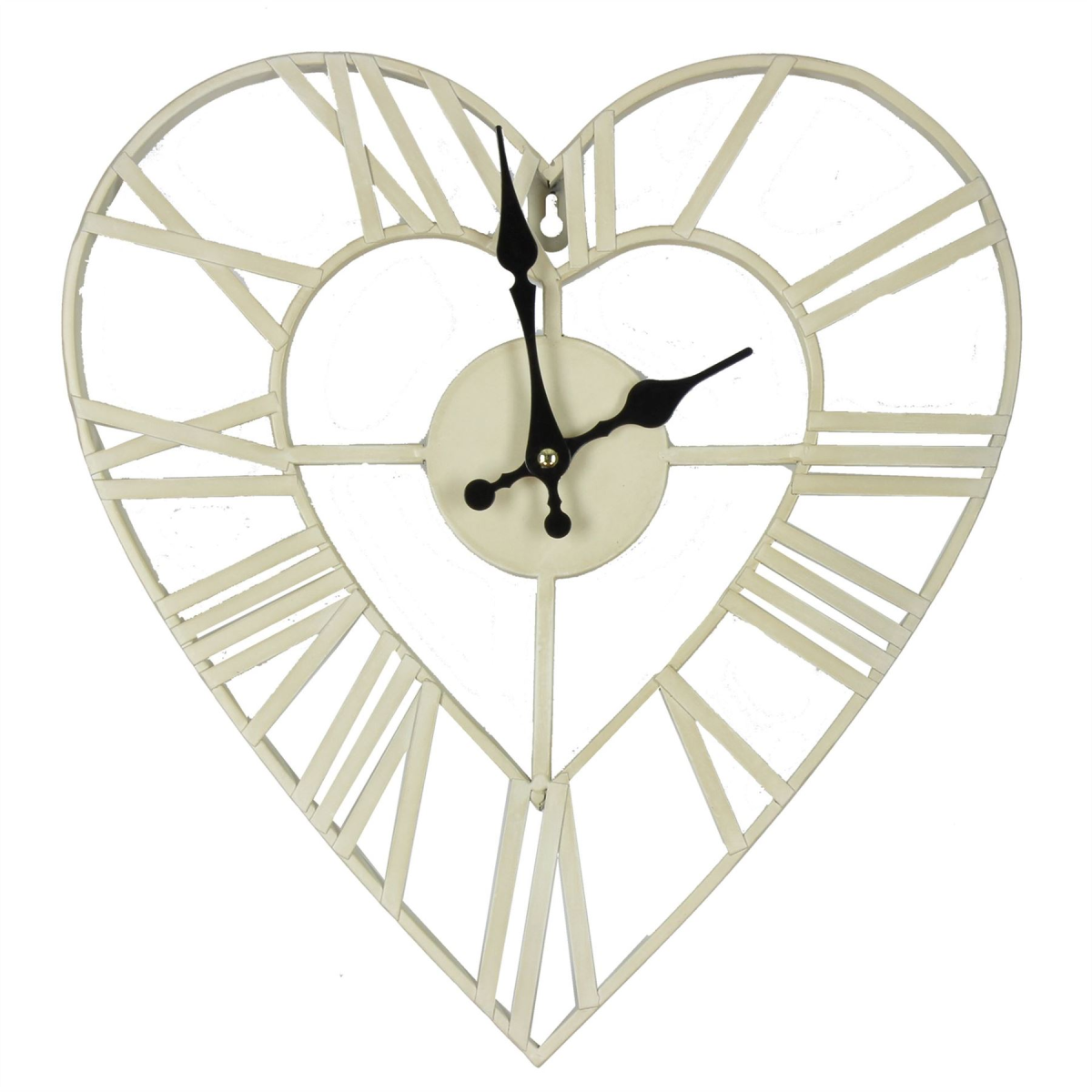 This stylish, shabby chic style wall clock will look perfect on display in any home, and makes a stunning focal point. It features a cut-out heart design with a roman numeral dial and easy to ready black spade hands. The precise quartz movement requires one AA battery (not included).