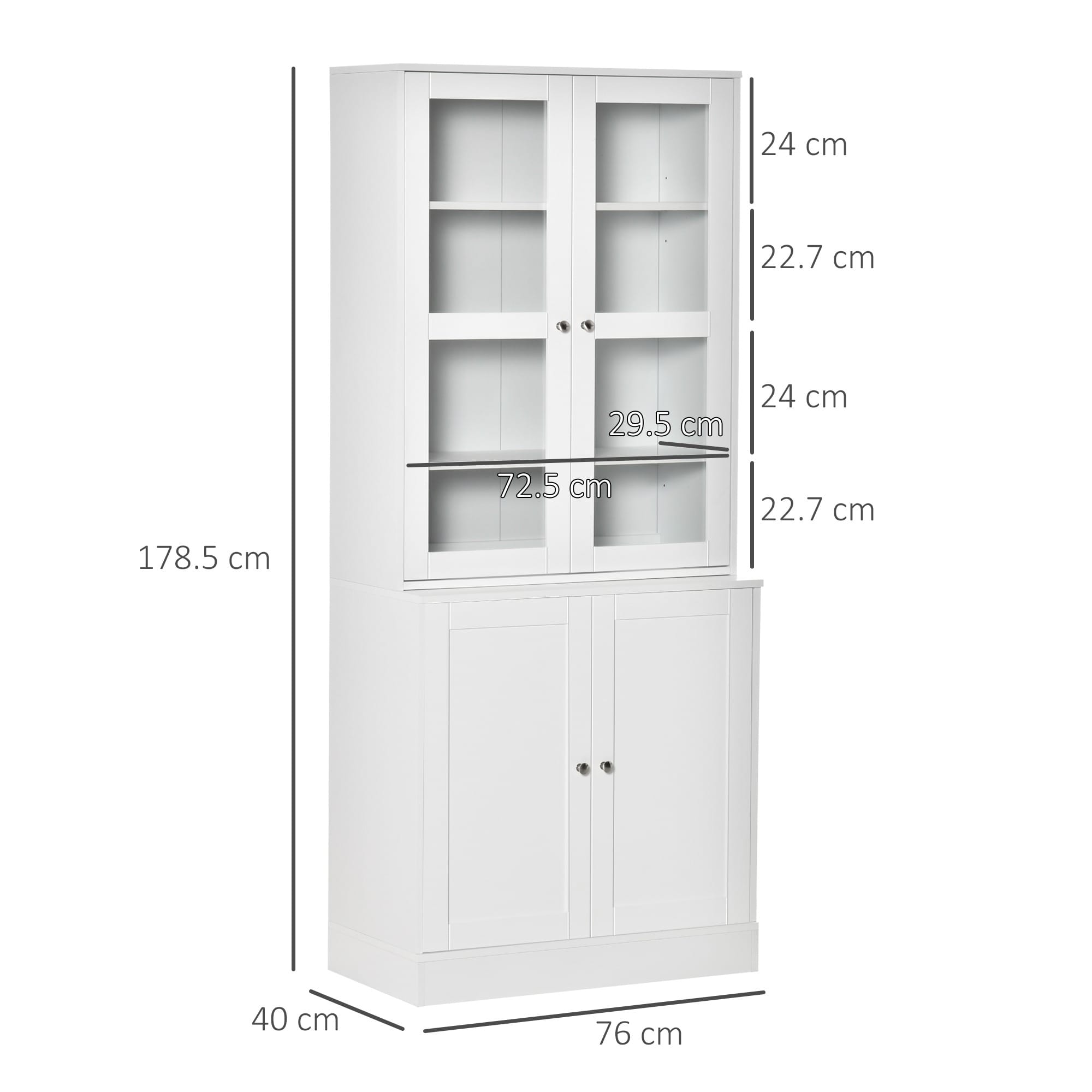 DOUBLE STORAGE: Formed of upper cabinet and bottom cupboard, a beautifully mixed way to store and display your items. Great for dining, lounge, kitchen and other home spaces. TWO ADJUSTABLE SHELVES: Upper cabinet tiers move up and down, so you can adjust to a position which suits you. GLASS DOORS: Tempered finish for extra strength and safety. Allows you to see inside the top half to display items beautifully. Handles on all doors to open and close easily. DIMENSIONS: 178.5H x 76W x 40Dcm. MAXIMUM LOAD: Whole: 30kg. Shelf: 5kg. ASSEMBLY REQUIRED.