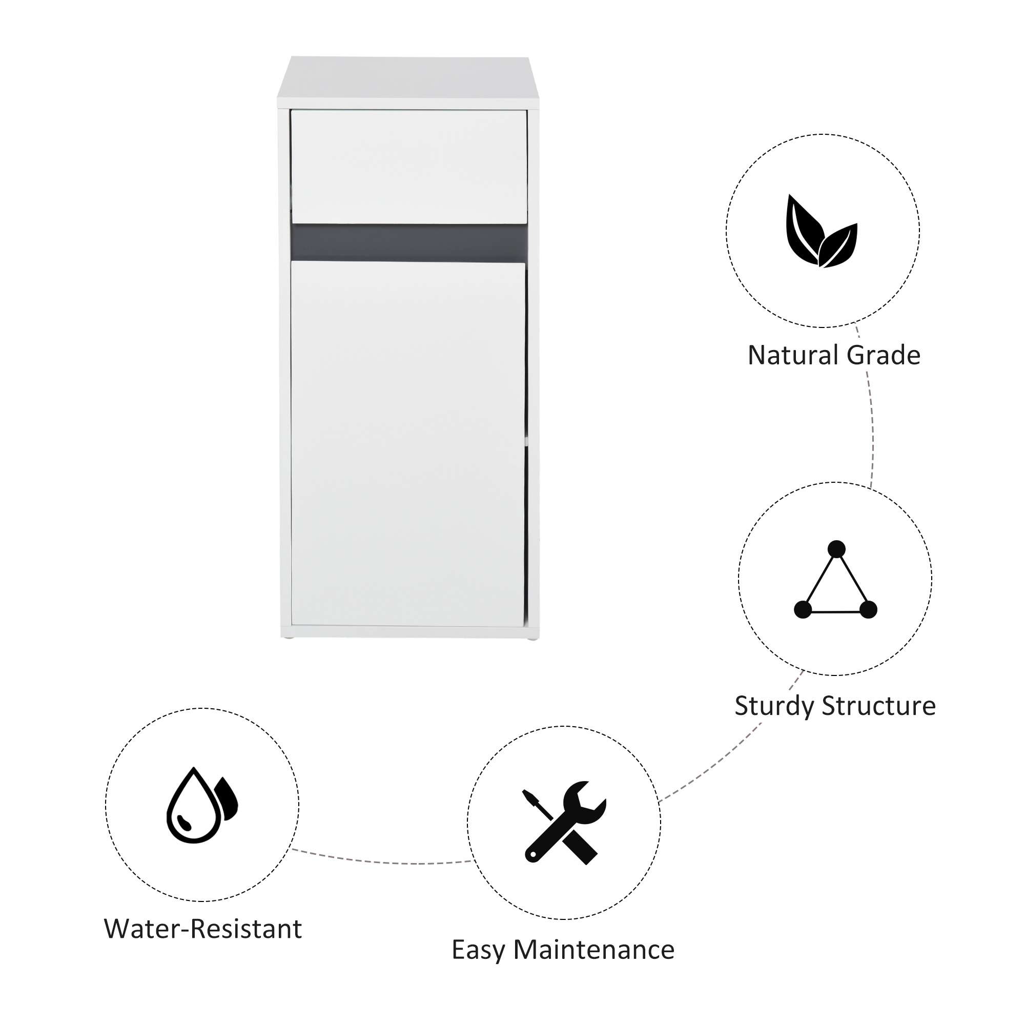 – DISCREET STORAGE: Features a large bottom cupboard and top slide-out drawer, offering ample space for holding toiletries and cleaning products. Adjustable shelf for organization.