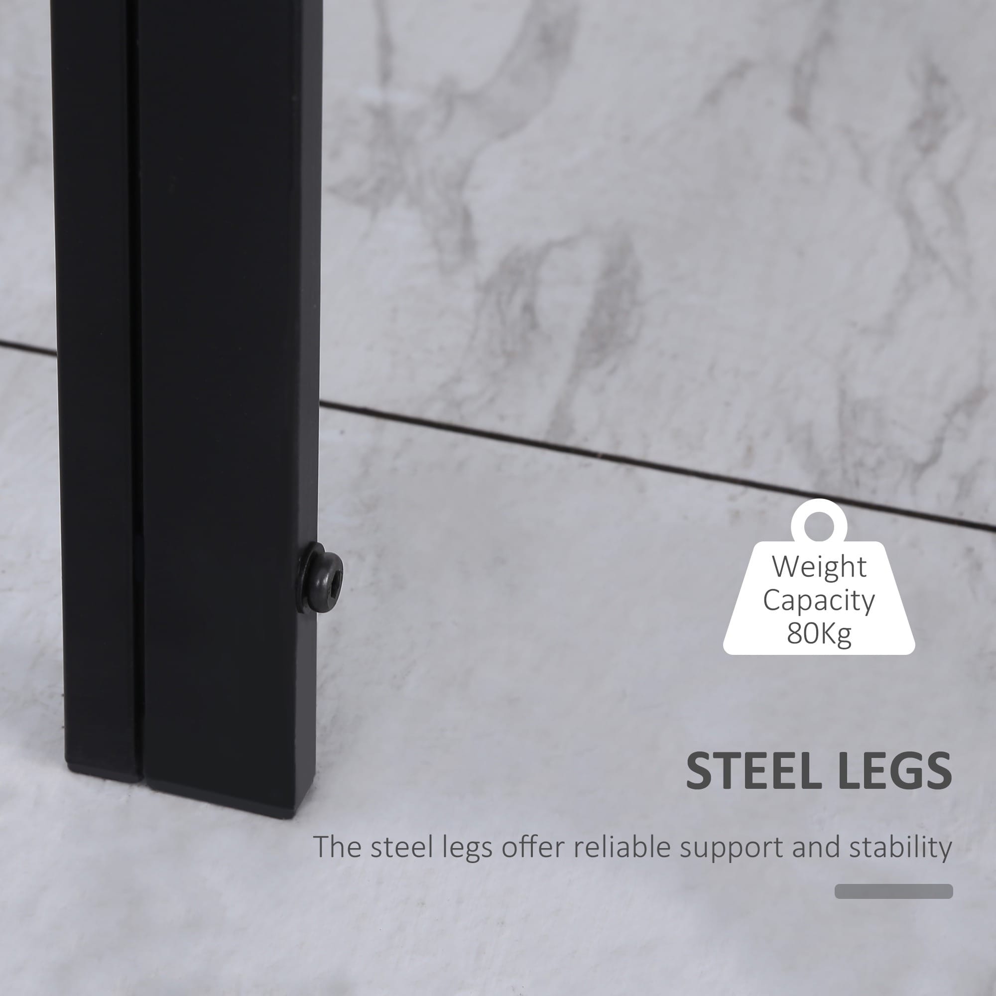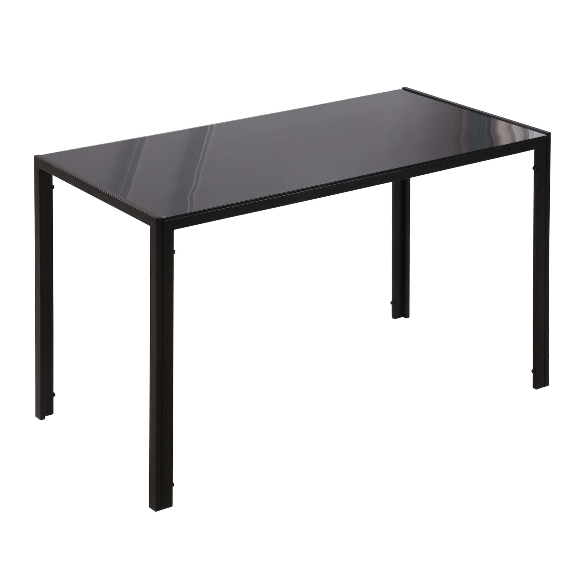 GLASS TABLE TOP: A sleek look to bring a modern feel into your dining areas, in the home and kitchen. Also ensures a solid and safe place to eat and drink from. STEEL FRAME: Powder coated for extra strength, a solid core structure to support the whole structure Square legs to keep stable. FOUR-PERSON SIZE: Great for everyday-family use, perfect for hosting small dinner parties and gatherings. Room to dine and drink. DIMENSIONS: 75H x 120L x 60Wcm. Glass: 6mm.