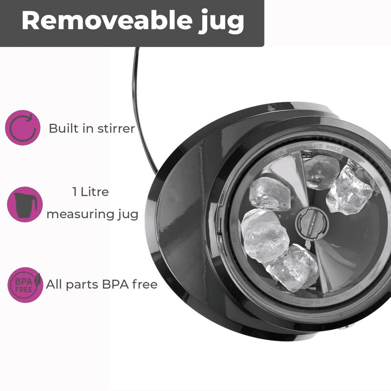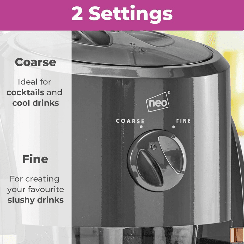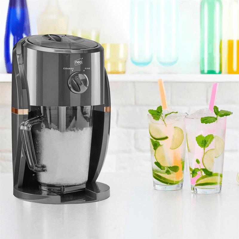 From ice-cold slushies to frozen cocktails, enjoy a huge range of drinks thanks to this easy-to-use machine, which crushes ice AND stirs your drinks. With its gorgeous retro design, the deluxe ice crusher is perfect for entertaining guests or bringing something different to your BBQ, and will go down a treat at children’s parties! You can choose either fine or coarse shaved ice by turning the dial on the front of the machine. Once crushed ice falls into the jug, it is constantly agitated by the stirrer which helps prevent it from sticking together, and if you add your fruit juice, alcohol or syrup to the jug, your drinks will be stirred too. There is even a measuring guide on the jug which tells you how much liquid should be added per quantity of ice so you’ll have the perfect slush consistency every time! Hooray! The 1 litre jug removes for easy serving – if you want to share that is! It’s also really easy to clean, along with the grinding compartment – which has removable parts to make things easier – and all parts are BPA free for your peace of mind. Shop with confidence as the Neo Electric Ice Crusher/Slush Maker is covered by a 1 year manufacturer’s warranty.