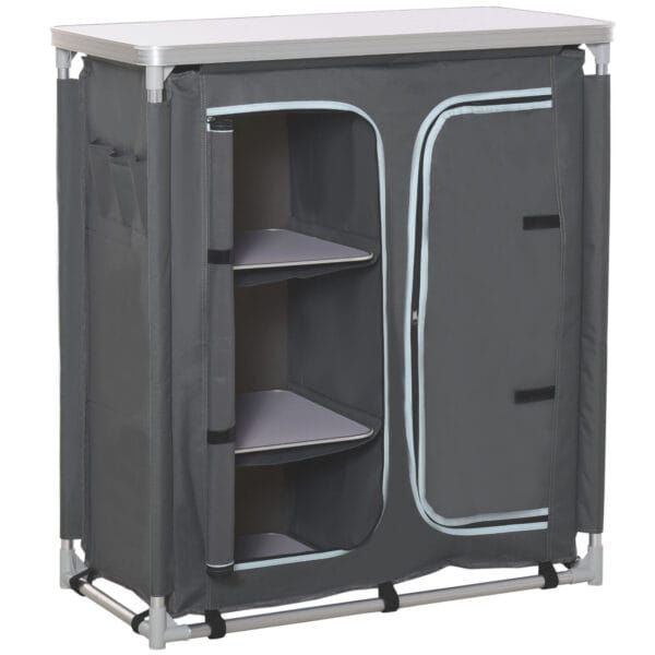 DUO USE: A camping table with storage gives a flat and reliable surface to use, with shelves underneath. Fabric coat with door to keep stored contents protected.