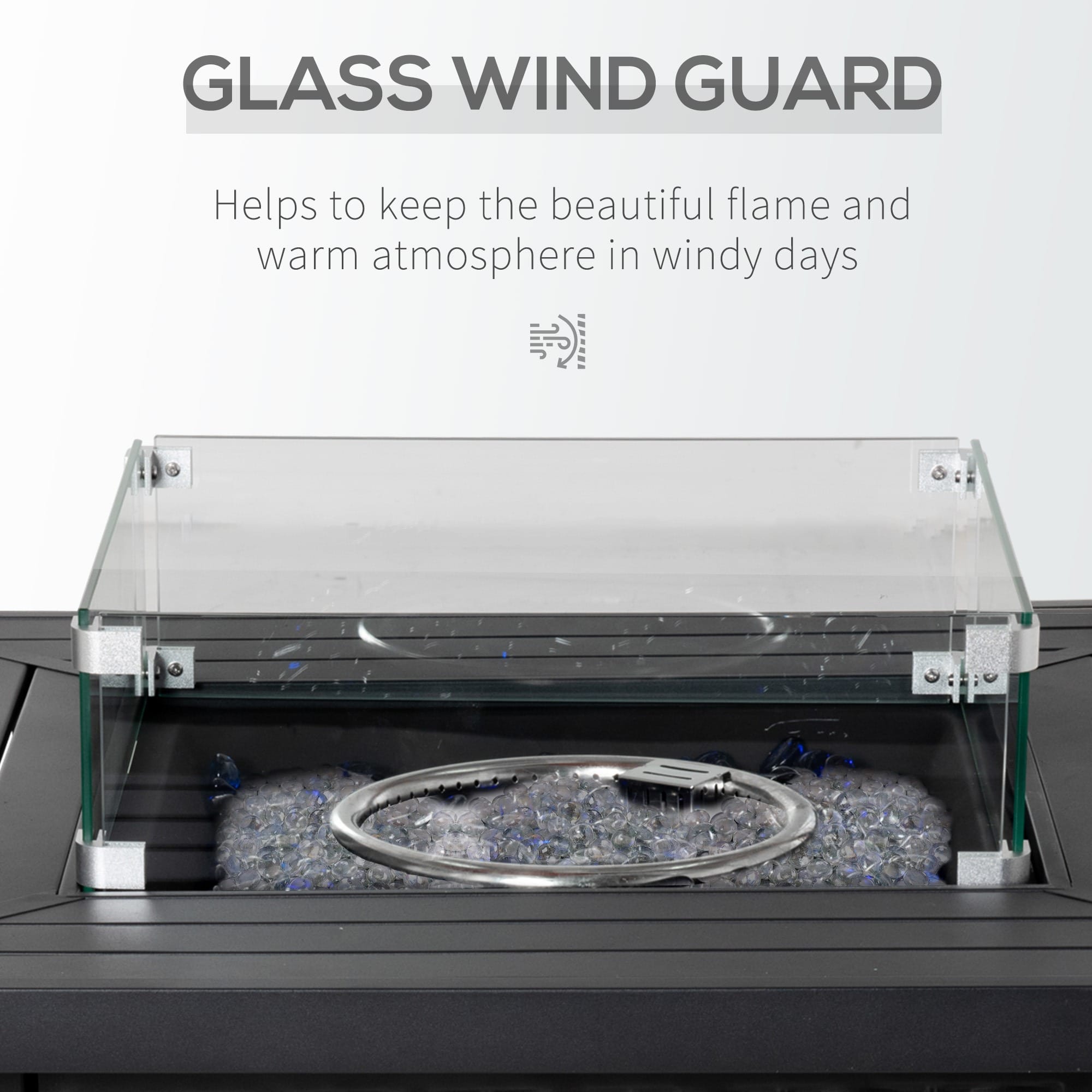 GLASS SCREEN: When windy, glass guards the beautiful flame safely – you can still see the beautiful vivid colours.