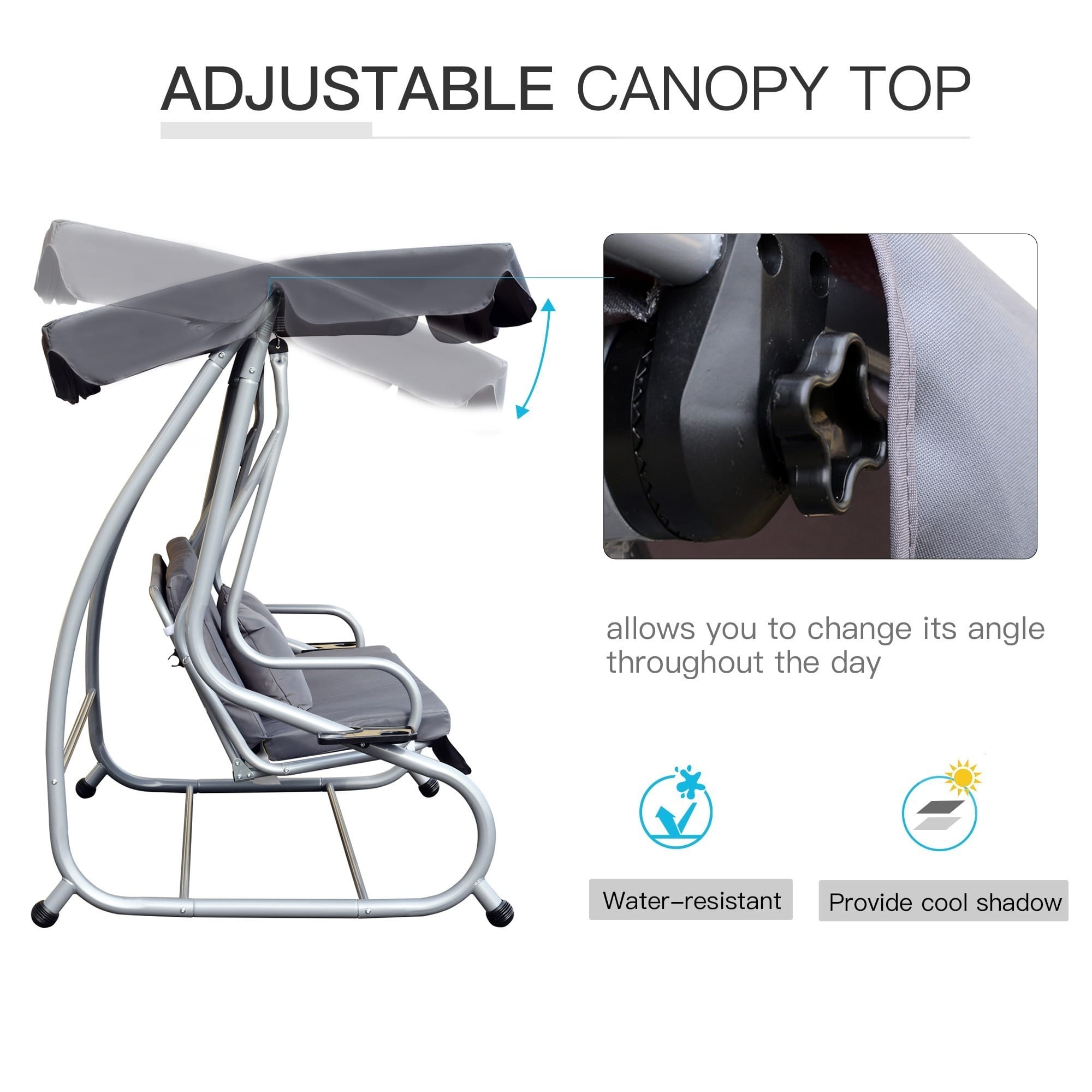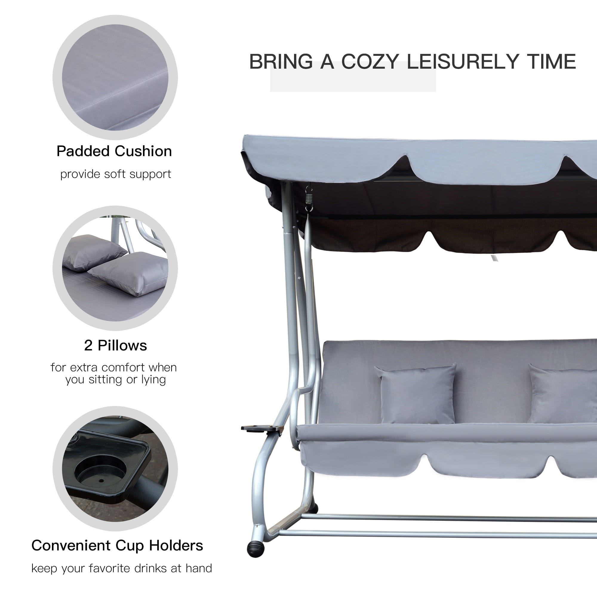 Ideal for garden, park, patio, yard, backyard and other outdoor areas 3 Seater swing chair converts to a comfy bed in seconds with adjustable backrest. Finest steel pipe supporting frame and polyester cloth in excellent craftsmanship Seat and backrest cushion filled with 900 g/cotton for superior comfort Cloth covering to provide UV protection 160 g/