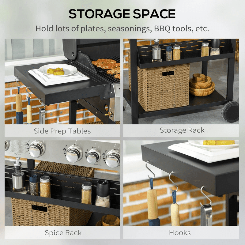 ? Storage: side table, bottom shelf, spice rack and side hooks