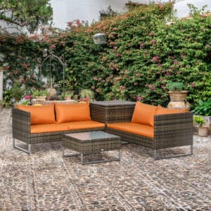 ● Four-piece outdoor dining set, includes two two-seater sofas, a tall square storage table and a small square coffee table
