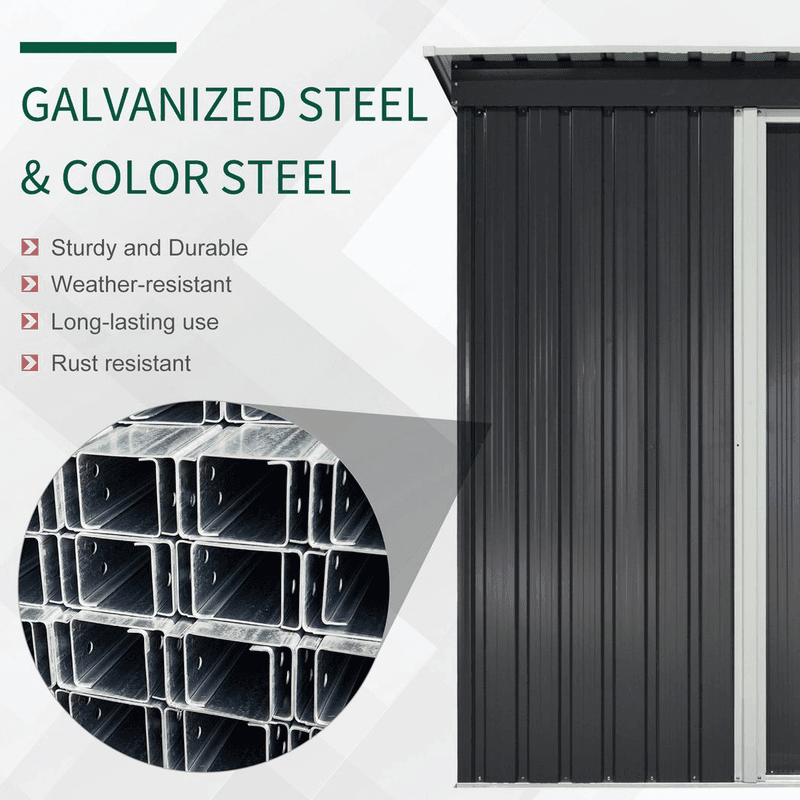 Ample storage space: The lean to shed provides enough storage space for garden tools, equipment and other outdoor equipment. Premium material: Made with high quality galvanized colour steel, this garden shed ensures strength and durability for long-lasting use. Sliding door design: The single sliding door is convenient for access in and out, it will be easier to get tools from the metal garden shed. Simple and elegant appearance: Practical outdoor storage shed with simple line and elegant appearance. Perfect for backyard, garden and other outdoor places. Dimensions: Overall Dimension: 163L x 89W x 182H cm, Inner Dimensions: 150L x 76W x 170H cm, Door Size: 61W x 165H cm.