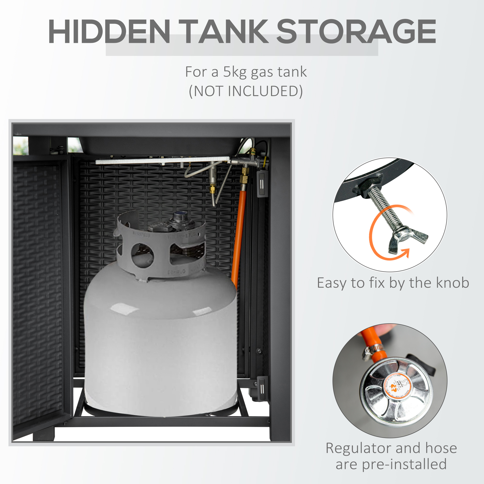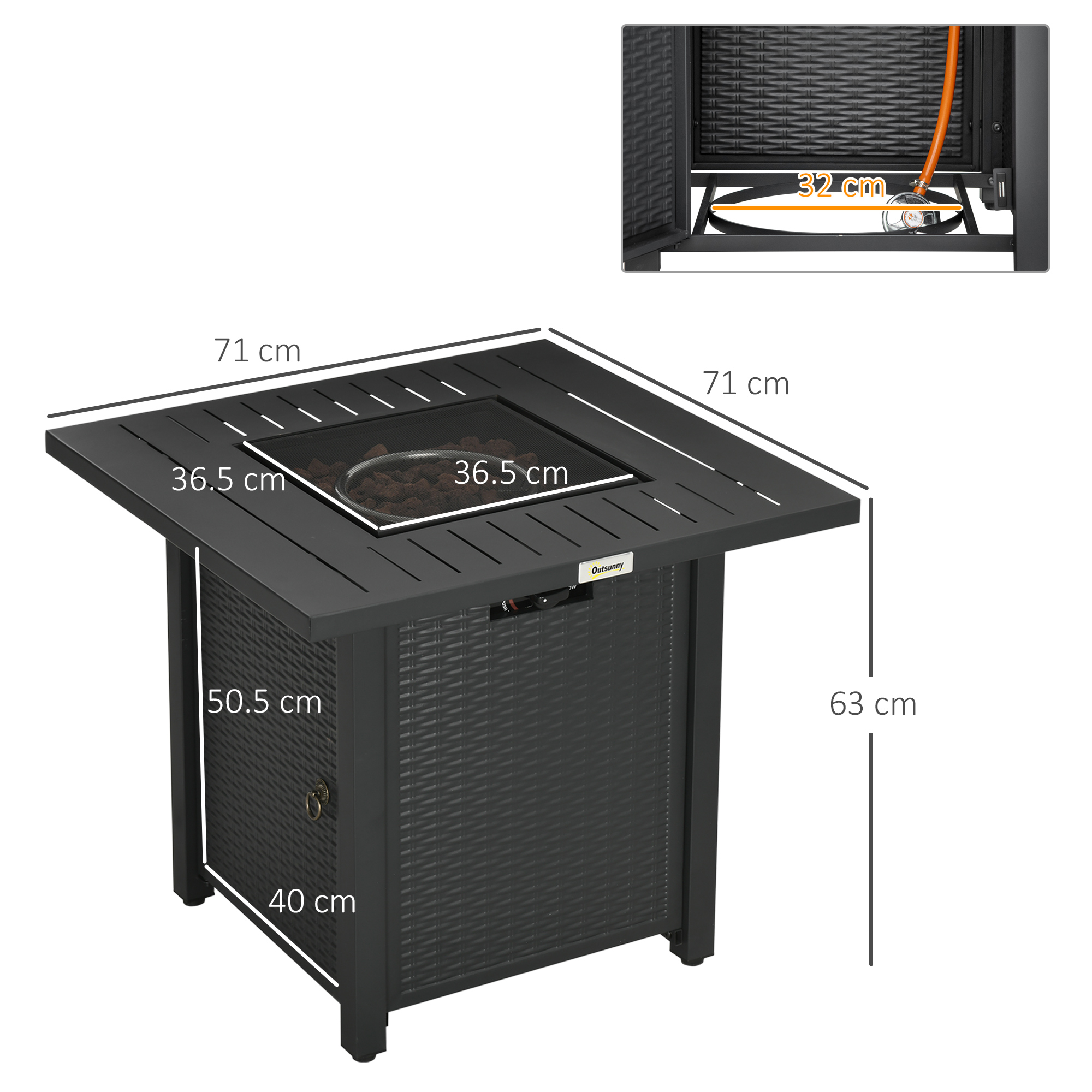 Rattan-style gas fire pit table: This propane fire pit doubles as a dining table when you lay down its lid. Share drinks, eat dinner, or roast marshmallows with friends. It’s a smokeless solution to bring a fireplace outside that makes the most of your space.50,000 BTU Burner: This 304 stainless steel burner provides a clean burn, and its electric ignition system and the adjustment knob make starting and controlling a flame easy (1 x AAA battery required for ignition, not included). The lava rocks help retain the warmth longer and help add a natural ambiance. For your safety: Equipped with a thermocouple that senses a drop in temperature when the flame goes out unexpectedly and closes the valve automatically to prevent gas escaping. Also comes with a protective spark guard mesh to avoid flying sparks. Protective Cover: This patio fire pit table comes with a waterproof and dustproof cover, so you don’t have to worry about rain or other weather damaging it when it’s not in use. Overall dimension: 71L x 71W x 63H cm. Regulator and hose are pre-installed for your convenience. Need a 5kg propane tank but NOT included.