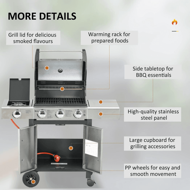 ? Deluxe design, consists of the four-burner grill, side grill, warming rack, side shelves and storage cabinet