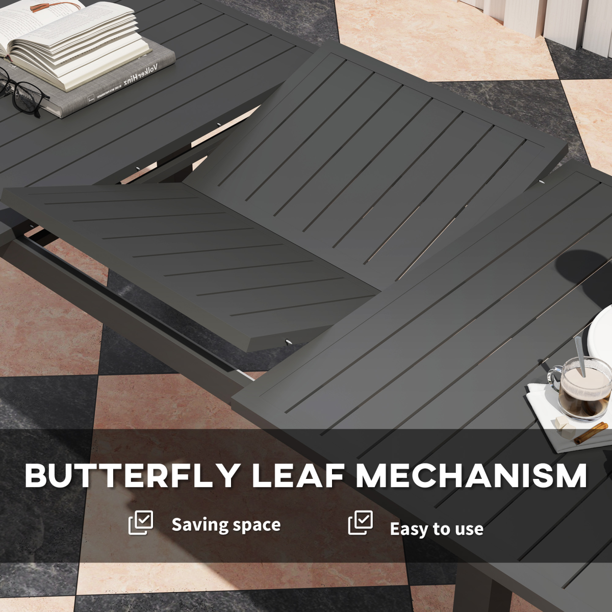 Elevate your al fresco dining experience with the Outsunny patio dining table, a charming blend of functionality and style. This outdoor table extends effortlessly using a butterfly leaf mechanism, seating 6-8 guests comfortably. Crafted with a robust all-aluminium frame and a slatted top, it’s a breeze to maintain and suitable for any garden gathering.