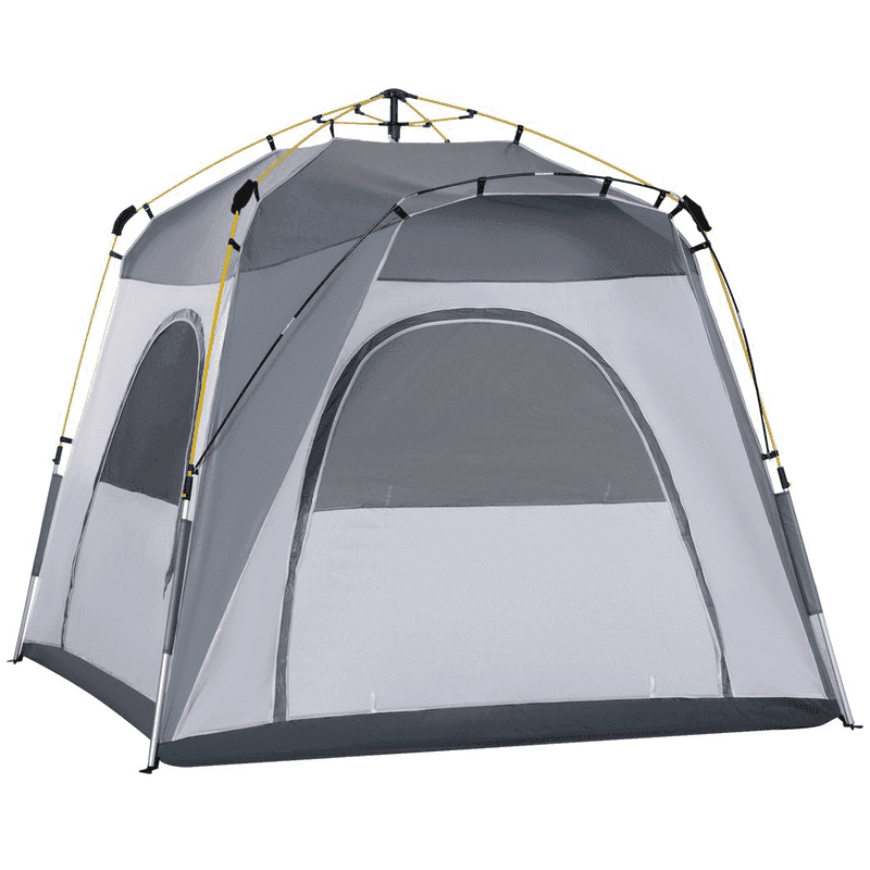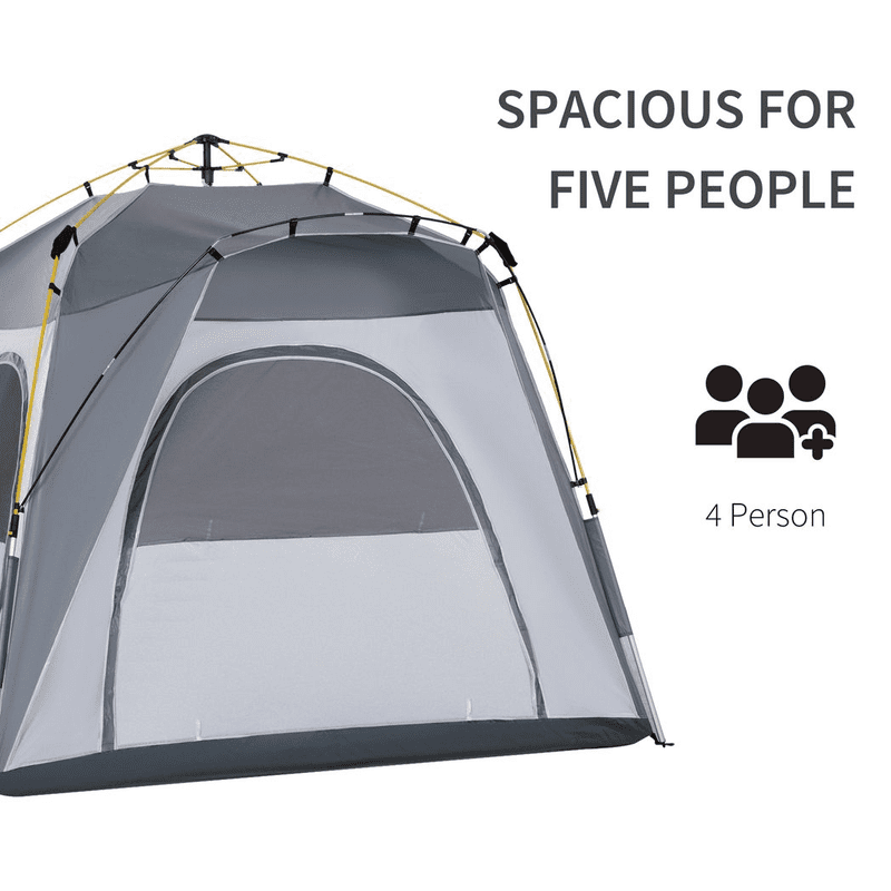 Pop-up design: Pre-attached poles, paired with the operation button and pressure mechanism to make this four-man pop up tent super easy to set up and start using.190 thread polyester shell: Tightly weaved fabric means this four man tent is weather-resistant: suitable for light weather conditions. Features large door to enter and leave easily, three windows for ventilation.