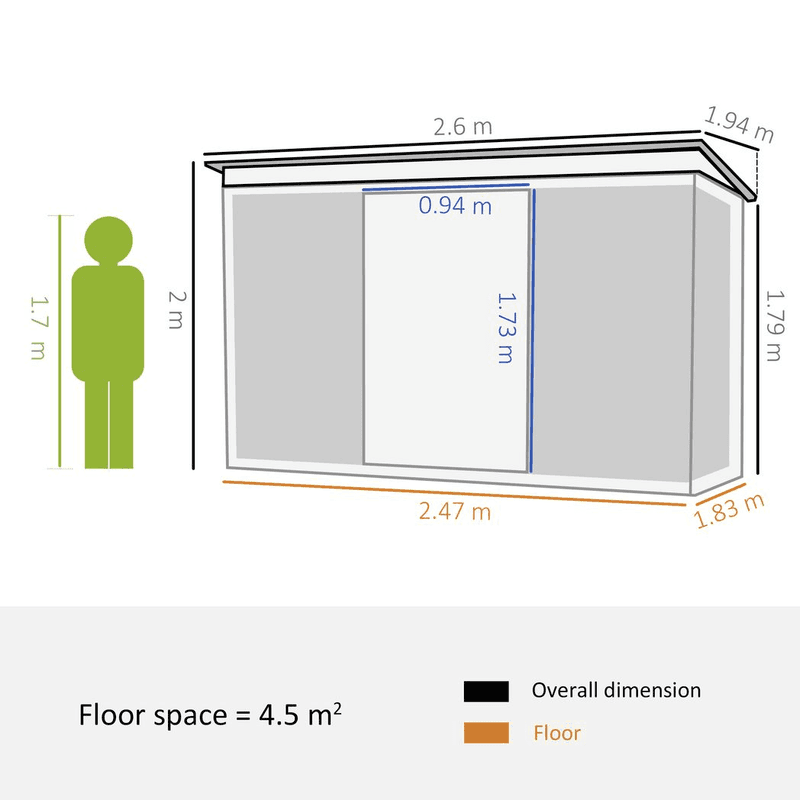 Double door shed design: Easy to enter this metal bike shed, also easy to fit larger items too. Lockable for safety. Dimensions: 179/200H x 194W x 260Lcm. Door: 173H x 94Wcm. Assembly required.