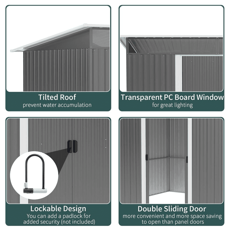 Light sky panel: Clear front pieces allows natural light to radiate inside, making the metal garden shed easy to see inside during the day – no lights required.