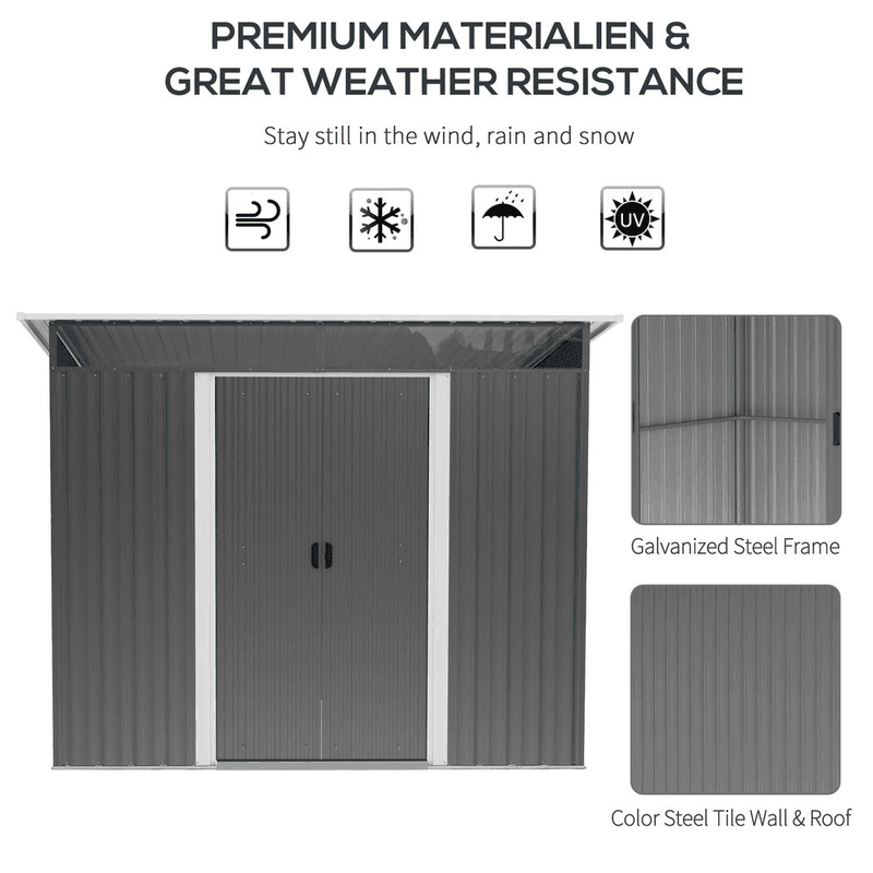 6.4 x 8.5ft size: Garden tool shed for keeping outdoor equipment, outerwear, furniture and other accessories. Freestanding design so you can set up wherever you want.