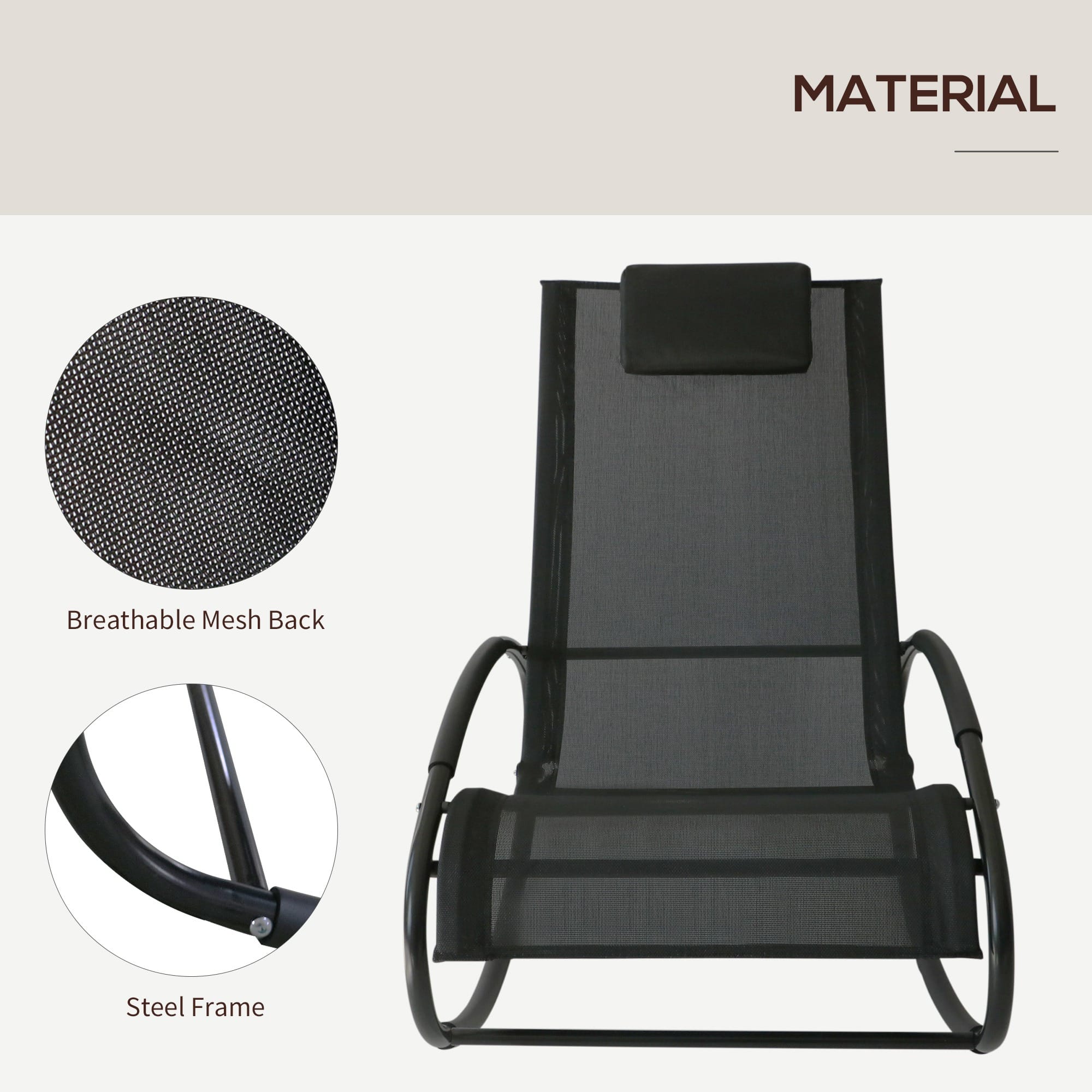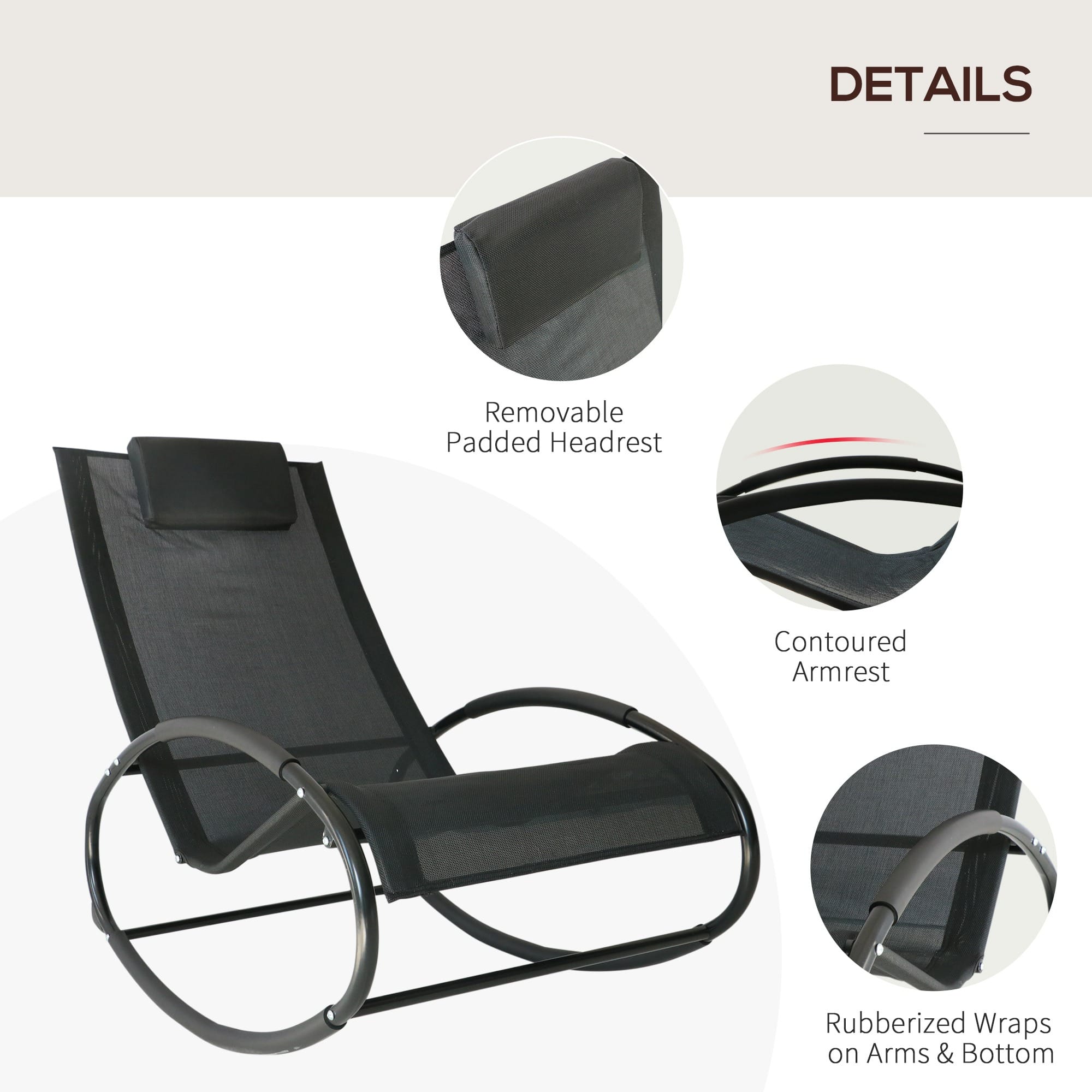 Orbital shaped, zero gravity sun lounger for hours of rocking relaxation Powder coated aluminium frame is both lightweight and sturdy Tough texteline cover is UV and water resistant Ergonomic curved shape hugs the contours of your body shape Padded on the bottom and arms for comfort with a removable pillow headrest for extra support Rubber wraps to stop scratching and damage Assembly required