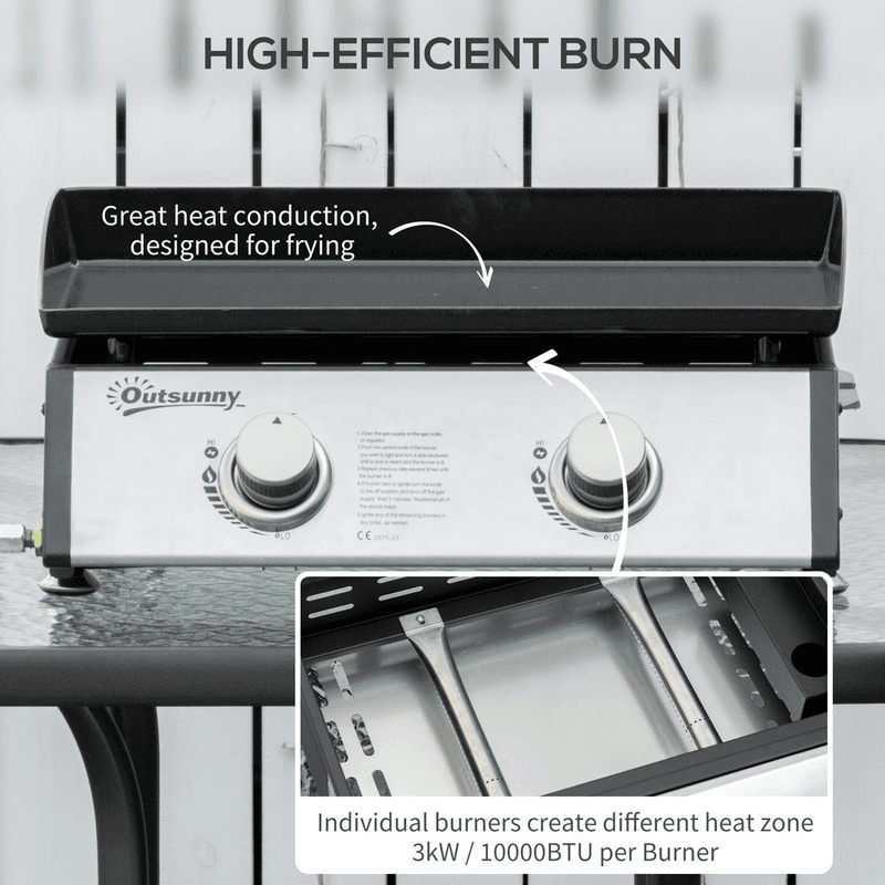 Two 10000 BTU burners – two cooking areas: A plancha grill which can cook two different types of food at two different temperatures.