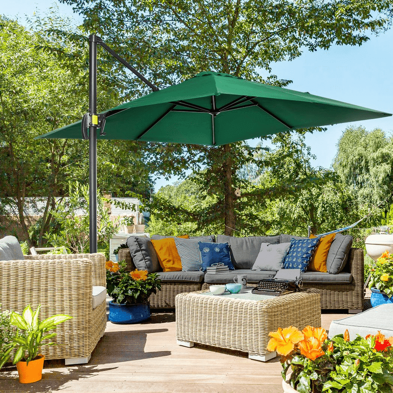 STYLISH DESIGN: The overhanging parasol is with beautiful and simplistic colour that suits all style gardens, patios etc. 2.45M x 2.45M SQUARE CANOPY: Covers a large surface area. UV and fade resistant.